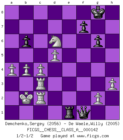 Last move : 1/2-1/2 2013 September 4 22:52:27 [Event "FICGS__CHESS__CLASS_A__000142"] [Site "FICGS"] [Date "2013.08.11"] [Round "1"] [White "Demchenko,Sergey"] [Black "De Waele,Willy"] [Result "1/2-1/2"] [WhiteElo "2056"] [BlackElo "2005"] 1.e4 c5 2.Nf3 d6 3.d4 cxd4 4.Nxd4 Nf6 5.Nc3 a6 6.f3 e5 7.Nb3 Be6 8.Be3 h5 9.Qd2 Nbd7 10.Nd5 Bxd5 11.exd5 g6 12.O-O-O Qc7 13.Kb1 Bg7 14.h3 Rc8 15.c4 b6 16.Be2 h4 17.Bg5 Kf8 18.Qe1 a5 19.Nd2 Kg8 20.Rc1 a4 21.Bxh4 a3 22.b3 e4 23.Bf2 Re8 24.Bd4 Nc5 25.fxe4 Ncxe4 26.Nf3 Qd8 27.Rc2 Nh5 28.Bxg7 Kxg7 29.Bd3 Nc5 30.Qc3+ Qf6 31.Rd1 Re3 32.b4 Na4 33.Qxa3 Nf4 34.Qxa4 Nxd3 35.Qb3 Qf5 36.Qc3+ Kh7 37.Qd2 Rhe8 38.Nd4 Qf4 39.Nb5 Kg8 40.Rc3 Nf2 41.Rdc1 Ne4 42.Qxe3 Nd2+ 43.Qxd2 Qxd2 44.R1c2 Qf4 45.Kb2 Re1 46.a4 Qf1 47.Nxd6 1/2-1/2 Sicilian : Najdorf Queenside Castling by player White (move 12) This chess game ended in a draw. Follow this game move after move (download)Chess is above all, a fight ! (Emanuel Lasker) Ein bischen Romantik kann weder im Schach noch in der Liebe schaden. Also versuche ich mich ab und zu daran zu erinnern. (Nigel Short) Una mala movida nulifica cuarenta buenas. (Horowitz) Le profane ne songe pas à la somme de jouissance dont il se prive, qui méconnaît ce jeu aux ressources aussi variées que passionnantes. (Jean-Marie Jeanton-Lamarche) Never risk one's whole fortune unless supported by one's entire army. (Niccolo Machiavelli)