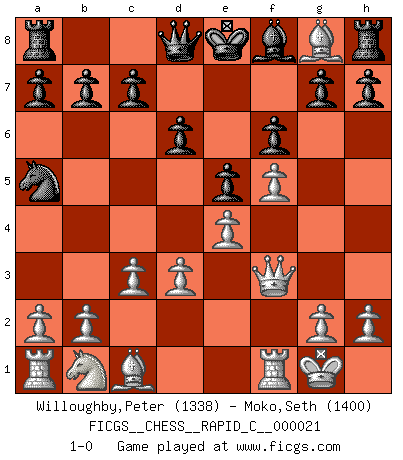 Last move : 1-0 2007 March 18 13:13:50 [Event "FICGS__CHESS__RAPID_C__000021"] [Site "FICGS"] [Date "2007.02.05"] [Round "1"] [White "Willoughby,Peter"] [Black "Moko,Seth"] [Result "1-0"] [WhiteElo "1338"] [BlackElo "1400"] 1.e4 e5 2.f4 d6 3.Nf3 Bg4 4.Bc4 Nc6 5.O-O Nd4 6.c3 Nc6 7.f5 f6 8.d3 Na5 9.Bxg8 Bxf3 10.Qxf3 1-0 This chess game has been lost on time (started : 2007.02.05 17:57:53) King's gambit Kingside Castling by player White (move 5) Player White won this chess game. Follow this game move after move (download)I had a toothache during the first game. In the second game I had a headache. In the third game it was an attack of rheumatism. In the fourth game, I wasn't feeling well. And in the fifth game? Well, must one have to win every game ? (Siegbert Tarrasch) Über Kasparov: Es ist offensichtlich, daß er in einem totalitären Staat aufwuchs und deshalb zu diktatorischen Zügen neigt. (Viktor Kortschnoi) Debemos de asegurarnos de que el Ajedrez no se convierta en un lenguaje muerto, muy interesante, pero tan solo para un grupo muy pequeño. (Sytze Faber) Si le désir cupide (et stupide) de gagner est une inépuisable source de souffrance, une combinaison brillante sur l'échiquier est une découverte : le coquelicot qui s'épanouit lorsque apparaît la Voie Lactée. (Arrabal) There is no vagueness without wind. (Chinese proverb)