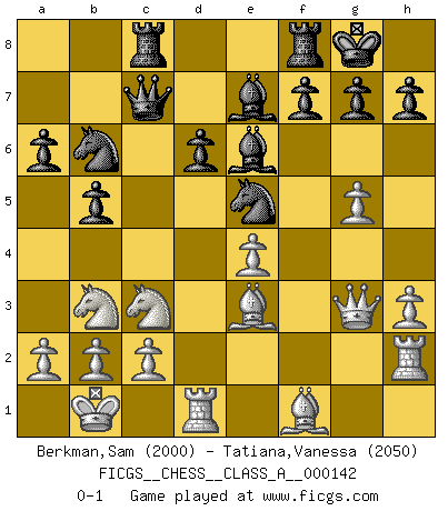 Last move : 0-1 2013 October 27 4:50:18 [Event "FICGS__CHESS__CLASS_A__000142"] [Site "FICGS"] [Date "2013.08.11"] [Round "1"] [White "Berkman,Sam"] [Black "Tatiana,Vanessa"] [Result "0-1"] [WhiteElo "2000"] [BlackElo "2050"] 1.e4 c5 2.Nf3 d6 3.d4 cxd4 4.Nxd4 Nf6 5.Nc3 a6 6.Be3 e5 7.Nb3 Be7 8.h3 Be6 9.f4 exf4 10.Bxf4 O-O 11.Qf3 Nc6 12.O-O-O Qb6 13.Be3 Qc7 14.g4 Nd7 15.Qg3 Rac8 16.g5 b5 17.Kb1 Nce5 18.Rh2 Nb6 0-1 Sicilian : Najdorf, Byrne (English) attack Kingside Castling by player Black (move 10) Queenside Castling by player White (move 12) Player Black won this chess game. Follow this game move after move (download)If one piece is badly posted, the whole game is bad. (Tarrasch) Frage: Was machen Sie mit den Preisen? Anwort: Ich habe Angst, dass meine Freundin davon neue Kleider kauft. (Loek van Wely) El Ajedrez es despiadado: debes de estar preparado para matar gente. (Nigel Short) Vouloir jouer aux échecs contre soi-même est aussi paradoxal que vouloir marcher sur son ombre. (Stefan Zweig) I fear not the man who has practiced 10,000 kicks once, but I fear the man who has practiced one kick 10,000 times. (Bruce Lee)
