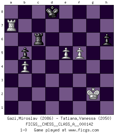 Last move : 1-0 2013 September 18 17:51:48 [Event "FICGS__CHESS__CLASS_A__000142"] [Site "FICGS"] [Date "2013.08.11"] [Round "1"] [White "Gazi,Miroslav"] [Black "Tatiana,Vanessa"] [Result "1-0"] [WhiteElo "2086"] [BlackElo "2050"] 1.d4 Nf6 2.Bg5 d5 3.Nd2 Nbd7 4.Ngf3 b6 5.e3 Bb7 6.c4 e6 7.cxd5 exd5 8.Ne5 h6 9.Bxf6 Qxf6 10.Nxd7 Kxd7 11.Qa4+ c6 12.Bd3 Kc7 13.O-O Rc8 14.b4 Bd6 15.Qb3 Rhd8 16.Rfe1 Qe7 17.Rab1 Kb8 18.a4 Rc7 19.Qc3 Bc8 20.e4 dxe4 21.Bxe4 f5 22.Bf3 Be6 23.g3 Qf6 24.Nc4 Bd5 25.Ne5 Bxe5 26.dxe5 Qe6 27.a5 b5 28.a6 g5 29.Rbd1 f4 30.Qc2 R8d7 31.Qe2 Bc4 32.Qb2 Bd5 33.Qa3 Rd8 34.Bxd5 cxd5 35.Qa5 Qe8 36.Rc1 Rxc1 37.Rxc1 Rc8 38.Re1 d4 39.Qa3 Rc6 40.Qd3 Rxa6 41.Qxd4 fxg3 42.hxg3 Rc6 43.Qd5 Re6 44.f4 gxf4 45.gxf4 Qf7 46.Rd1 Rg6+ 47.Kh1 Qe7 48.Qd8+ Qxd8 49.Rxd8+ Kc7 50.Ra8 Ra6 51.f5 Kd7 52.Kg2 Ke7 53.Rh8 Rc6 54.Rh7+ Kd8 55.Rxa7 1-0 Trompowsky attack (Ruth, Opovcensky Opening) Kingside Castling by player White (move 13) 10 pieces endgame at move 49 : White KRPPP , Black KRPPP WHITE : King + 1 Rook 3 Pawns BLACK : King + 1 Rook 3 Pawns 9 pieces endgame at move 55 : White KRPPP , Black KRPP WHITE : King + 1 Rook 3 Pawns BLACK : King + 1 Rook 2 Pawns Player White won this chess game. Follow this game move after move (download)The sign of a great Master is his ability to win a won game quickly and painlessly. (Irving Chernev) Kein Großmeister ist normal. Sie unterscheiden sich nur im Ausmaß Ihrer Verrücktheit. (Viktor Kortschnoi) Un sacrificio se refuta mucho mejor al aceptarlo. (Wilhelm Steinitz) À la honte des hommes, on sait que les lois du jeu sont les seules qui soient partout justes, claires, inviolables et exécutées. Pourquoi l'Indien qui a donné les règles du jeu d'échecs est-il obéi de bon gré dans toute la terre, et que les décrétales des papes, par exemple, sont aujourd'hui un objet d'horreur et de mépris ? C'est que l'inventeur des échecs combina tout avec justesse pour la satisfaction des joueurs, et que les papes, dans leurs décrétales, n'eurent en vue que leur seul avantage. L'Indien voulut exercer également l'esprit des hommes et leur donner du plaisir; les papes ont voulu abrutir l'esprit des hommes. Voltaire (Dictionnaire philosophique / Garnier 1967) Somehow our devils are never quite what we expect when we meet them face to face. (Nelson DeMille)