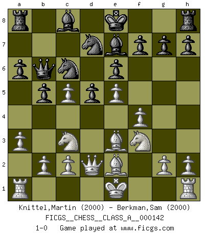 Last move : 1-0 2013 December 5 8:37:38 [Event "FICGS__CHESS__CLASS_A__000142"] [Site "FICGS"] [Date "2013.08.11"] [Round "1"] [White "Knittel,Martin"] [Black "Berkman,Sam"] [Result "1-0"] [WhiteElo "2000"] [BlackElo "2000"] 1.e4 e6 2.d4 d5 3.Nc3 Nf6 4.e5 Nfd7 5.f4 c5 6.Nf3 Nc6 7.Be3 a6 8.Qd2 Be7 9.Be2 b5 10.a3 Qb6 11.dxc5 1-0 French : Steinitz, Boleslavsky variation Player White won this chess game. Follow this game move after move (download)Up to this point White has been following well-known analysis. But now he makes a fatal error: he begins to use his own head. (Siegbert Tarrasch) Bis jetzt ist Weiß einer wohlbekannten Analyse gefolgt. Aber jetzt begeht er einen schrecklichen Fehler: Er beginnt seinen eigenen Kopf zu benutzen. (Siegbert Tarrasch) Hay jugadores fuertes y personas amables y yo soy un jugador fuerte. (Bobby Fischer) Le succès, c'est être capable d'aller d'échec en échec sans perdre son enthousiasme. (Winston Churchill) Everybody lies. (Gregory House, House M.D.)