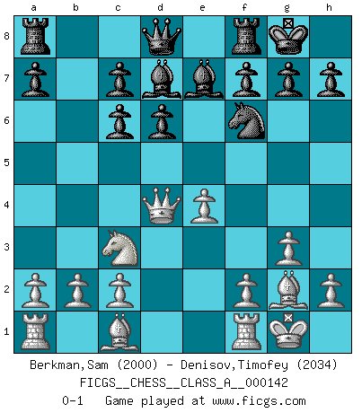 Last move : 0-1 2013 October 27 4:50:18 [Event "FICGS__CHESS__CLASS_A__000142"] [Site "FICGS"] [Date "2013.08.11"] [Round "1"] [White "Berkman,Sam"] [Black "Denisov,Timofey"] [Result "0-1"] [WhiteElo "2000"] [BlackElo "2034"] 1.e4 e5 2.Nf3 d6 3.d4 exd4 4.Nxd4 Nf6 5.Nc3 Be7 6.g3 O-O 7.Bg2 Nc6 8.O-O Bg4 9.Nxc6 bxc6 10.Qd4 Bd7 0-1 Philidor : Exchange variation Kingside Castling by player Black (move 6) Kingside Castling by player White (move 8) Player Black won this chess game. Follow this game move after move (download)All Chess players should have a hobby. (Savielly Tartakower) Wie bekannt hörte Morphy 1859 auf, Schach zu spielen. Seine Enttäuschung galt nicht so sehr dem Schach, wie den Schachspielern. (Robert James Fischer) Diferente gente reacciona diferentemente en aceptar la derrota. (Bobby Fischer) Mais n'est-ce pas déjà le limiter injurieusement que d'appeler les échecs un jeu? N'est-ce pas aussi une science, un art, ou quelque chose qui, comme le cercueil de Mahomet entre ciel et terre, est suspendu entre l'un et l'autre, et qui réunit un nombre incroyable de contraires ? (Stefan Zweig) I know the human being and fish can coexist peacefully. (George W. Bush, Saginaw sept. 29, 2000)