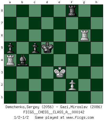 Last move : 1/2-1/2 2013 October 11 23:23:37 [Event "FICGS__CHESS__CLASS_A__000142"] [Site "FICGS"] [Date "2013.08.11"] [Round "1"] [White "Demchenko,Sergey"] [Black "Gazi,Miroslav"] [Result "1/2-1/2"] [WhiteElo "2056"] [BlackElo "2086"] 1.e4 c5 2.Nf3 Nc6 3.d4 cxd4 4.Nxd4 Nf6 5.Nc3 e5 6.Ndb5 d6 7.Bg5 a6 8.Na3 b5 9.Nd5 Be7 10.Bxf6 Bxf6 11.c3 Bg5 12.Nc2 Ne7 13.h4 Bh6 14.a4 bxa4 15.Ncb4 O-O 16.Rxa4 Nxd5 17.Nxd5 a5 18.b4 Be6 19.b5 Rc8 20.c4 Rc5 21.Be2 Bxd5 22.exd5 e4 23.g3 f5 24.O-O g6 25.Kg2 Rc8 26.h5 Bg7 27.hxg6 hxg6 28.Qd2 Be5 29.Qe3 Rc7 30.Rh1 Qf6 31.Qh6 f4 32.Bg4 fxg3 33.Be6+ R8f7 34.Qe3 Qf3+ 35.Qxf3 exf3+ 36.Kh3 Kf8 37.Bxf7 Rxf7 38.c5 g2 39.Re1 dxc5 40.b6 Bc3 41.Rg1 Bb4 42.Kg3 Ke7 43.b7 Rf8 44.b8Q Rxb8 45.Kxf3 Rf8+ 46.Ke3 Kd6 47.Rxg2 Kxd5 48.Rxg6 1/2-1/2 Sicilian : Pelikan (Lasker/Sveshnikov) variation Kingside Castling by player Black (move 15) Kingside Castling by player White (move 24) Promotion Queen by player White (move 44) 10 pieces endgame at move 47 : White KRRP , Black KRBPPP WHITE : King + 2 Rooks 1 Pawn BLACK : King + 1 Rook 1 Bishop 3 Pawns 9 pieces endgame at move 48 : White KRRP , Black KRBPP WHITE : King + 2 Rooks 1 Pawn BLACK : King + 1 Rook 1 Bishop 2 Pawns This chess game ended in a draw. Follow this game move after move (download)There must have been a time when men were demigods, or they could not have invented Chess. (Gustav Schenk) Der beste Spieler in einem Turnier gewinnt es nie. Er landet auf Platz zwei oder drei. (Siegbert Tarrasch) Una mala movida nulifica cuarenta buenas. (Horowitz) Que feriez-vous si vous étiez en train de jouer aux échecs et que la fin du monde arrive ? Je continuerais à jouer. (Saint Borromée) I would love to change the world, but they won't give me the source code. (Unknown)