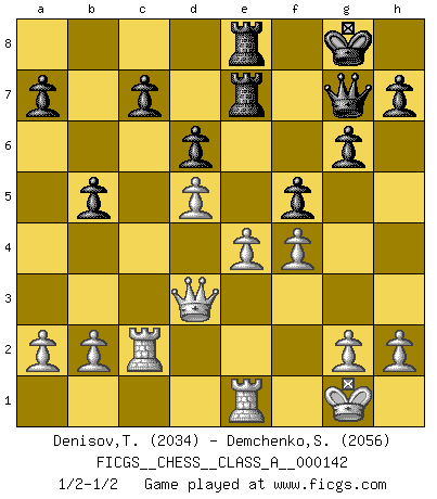 Last move : 1/2-1/2 2013 September 6 4:19:35 [Event "FICGS__CHESS__CLASS_A__000142"] [Site "FICGS"] [Date "2013.08.11"] [Round "1"] [White "Denisov,Timofey"] [Black "Demchenko,Sergey"] [Result "1/2-1/2"] [WhiteElo "2034"] [BlackElo "2056"] 1.d4 Nf6 2.c4 g6 3.Nc3 Bg7 4.e4 d6 5.Be2 O-O 6.Nf3 e5 7.O-O exd4 8.Nxd4 Re8 9.f3 Nc6 10.Be3 Nh5 11.Qd2 Nf4 12.Rad1 Nxd4 13.Bxd4 Bxd4+ 14.Qxd4 Nxe2+ 15.Nxe2 b6 16.Nf4 Bb7 17.Nd5 Bxd5 18.cxd5 Rc8 19.Rc1 Re5 20.f4 Re7 21.Rc6 Qf8 22.Re1 Rce8 23.Rc2 Qg7 24.Qc4 b5 25.Qd3 f5 1/2-1/2 King's Indian : 5.Be2 Kingside Castling by player Black (move 5) Kingside Castling by player White (move 7) This chess game ended in a draw. Follow this game move after move (download)In complicated positions, Bobby Fischer hardly had to be afraid of anybody. (Paul Keres) Fischer ist das größte Genie, das je vom Schachhimmel heruntergestiegen ist. (Mikhail Nekhemyevich Tal) Para mi, el Ajedrez es la vida y cada partida es como una nueva vida. Todo jugador de Ajedrez suele vivir muchas vidas durante su vida. (Eduard Gufeld) Des points faibles ou des trous dans la position de l'adversaire doivent être occupés par des pièces et non pas par des pions. (Siegbert Tarrasch) As the days dwindle down... to a precious few. (Maxwell Anderson)