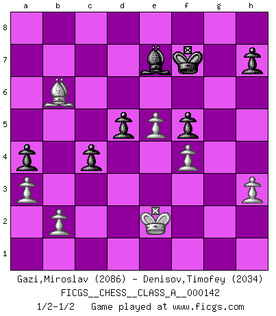 Last move : 1/2-1/2 2013 October 29 19:24:46 [Event "FICGS__CHESS__CLASS_A__000142"] [Site "FICGS"] [Date "2013.08.11"] [Round "1"] [White "Gazi,Miroslav"] [Black "Denisov,Timofey"] [Result "1/2-1/2"] [WhiteElo "2086"] [BlackElo "2034"] 1.d4 d5 2.c4 dxc4 3.e3 e6 4.Bxc4 Nf6 5.Nf3 c5 6.O-O a6 7.Bb3 Be7 8.Nc3 O-O 9.e4 cxd4 10.Nxd4 Qc7 11.Be3 Nc6 12.Nxc6 bxc6 13.Rc1 c5 14.Qe2 Rd8 15.f3 Nd7 16.f4 a5 17.Bc4 Nb6 18.Bb5 Bd7 19.Rfd1 a4 20.a3 Bxb5 21.Rxd8+ Rxd8 22.Qxb5 Rb8 23.Qe2 g6 24.Rc2 Qc6 25.Bf2 Bf8 26.g3 f5 27.h3 Bg7 28.e5 Bf8 29.g4 Be7 30.Kh2 Kh8 31.Qd3 Nd5 32.Qf3 Qa8 33.gxf5 gxf5 34.Bg1 Rd8 35.Rg2 Rg8 36.Rxg8+ Kxg8 37.Bf2 c4 38.Bd4 Kg7 39.Kg3 Qd8 40.Nxd5 Bh4+ 41.Kg2 Qxd5 42.Qxd5 exd5 43.Kf3 Be7 44.Ke2 Kf7 45.Bb6 1/2-1/2 Queen's gambit accepted Kingside Castling by player White (move 6) Kingside Castling by player Black (move 8) This chess game ended in a draw. Follow this game move after move (download)Capture of the adverse King is the ultimate but not the first object of the game. (William Steinitz) Die Fehler sind da, Sie warten nur darauf gemacht zu werden. (Savielly Grigorievitsch Tartakower) Yo he agregado estos principios a la ley: pongan los Caballos en acción antes de que los dos Alfiles sean desarrollados. (Emanuel Lasker) Il a essayé de se convaincre qu'il pourrait empêcher toutes les erreurs et ne jamais perdre. L'horreur ! Gary Kasparov au sujet de Robert Fischer. You think that education is too expensive ? Try ignorance. (Derek Bok)