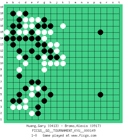 Last move : 1-0 2013 October 29 6:33:22 [Event "FICGS__GO__TOURNAMENT_KYU__000149"] [Site "FICGS"] [Date "2013.08.11"] [Round "1"] [Black "Huang,Gary"] [White "Bromo,Alexis"] [Result "1-0"] [Rating 1 "0413"] [Rating 2 "0917"] 1.q15 d4 2.d6 d16 3.q5 k16 4.c4 c3 5.c5 d3 6.g4 d10 7.f2 e2 8.b4 b3 9.f3 e5 10.f7 f6 11.g6 e6 12.e7 g5 13.h5 k10 14.c8 c9 15.f5 g9 16.c17 d17 17.c16 c18 18.b18 c15 19.b15 b14 20.b16 a15 21.c14 d15 22.b13 c13 23.d14 d13 24.e14 e13 25.f14 f15 26.e15 e16 27.f16 g15 28.g16 g14 29.f13 f12 30.g13 h13 31.g12 g11 32.h12 j12 33.h11 h10 34.j11 k11 35.a14 j10 36.b14 j13 37.h16 f17 38.d18 e17 39.g17 h15 40.f11 g10 41.e12 d12 42.d11 c11 43.c12 1-0 Here are the names of the openings (joseki) played in the four corners : Corner d4 : d4 d6 Hoshi (Hwajeom, Seongjeom, Xingwei`) 4-4 Point. The star or hoshi (4-4) point, emphasizing influence at the potential expense of territory. Ikken Takagakari (Hankan Nop'dakeolch'im, Yi Gaojia, 1-Space High Approach). White typically responds at 6-4 or 3-10. White 4-10 is played when White finds play on the right side advantageous. White 4-8 or 3-8 may be played when White has support at top. Corner d16 : d16 c17 Hoshi (Hwajeom, Seongjeom, Xingwei`) 4-4 Point. The star or hoshi (4-4) point, emphasizing influence at the potential expense of territory. Player Black won this Go (weiqi, baduk) game. Follow this game move after move (download)Dead group ? Always win ko fights ! (Anonymous) You have to believe in yourself. (Sun Tzu)