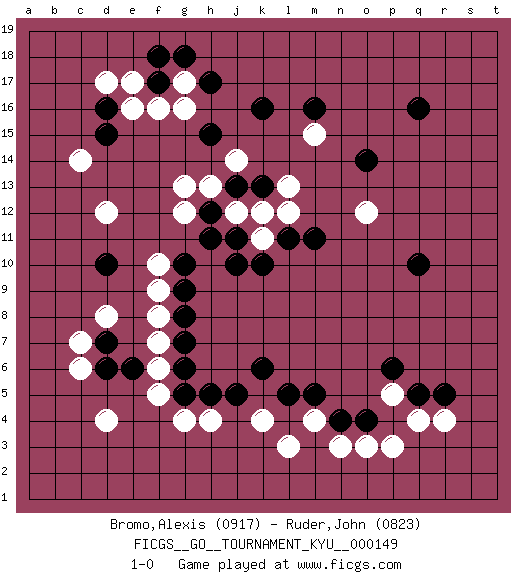 Last move : 1-0 2013 November 9 18:21:26 [Event "FICGS__GO__TOURNAMENT_KYU__000149"] [Site "FICGS"] [Date "2013.08.11"] [Round "1"] [Black "Bromo,Alexis"] [White "Ruder,John"] [Result "1-0"] [Rating 1 "0917"] [Rating 2 "0823"] 1.q16 d4 2.d16 q4 3.q10 c14 4.d10 d12 5.k16 f16 6.f17 g17 7.h17 g16 8.h15 e17 9.f18 e16 10.g18 d17 11.d15 g13 12.h12 h13 13.j13 j12 14.j11 k12 15.k13 g12 16.h11 k11 17.j10 l13 18.k10 o12 19.o14 m15 20.m16 j14 21.l11 l12 22.m11 k4 23.k6 f10 24.g10 f9 25.g9 f8 26.g8 c7 27.d7 c6 28.d6 d8 29.e6 f7 30.g7 f6 31.g6 f5 32.g5 g4 33.h5 h4 34.j5 l3 35.l5 o3 36.n4 n3 37.o4 p3 38.q5 r4 39.r5 m4 40.m5 p5 41.p6 1-0 This go game has been lost on time (started : 2013.08.11 15:47:27) Here are the names of the openings (joseki) played in the four corners : Corner d16 : d16 c14 Hoshi (Hwajeom, Seongjeom, Xingwei`) 4-4 Point. The star or hoshi (4-4) point, emphasizing influence at the potential expense of territory. Ikken Kakari (Hankan Keolch'im, Yi Gua`jiao~, 1-Space Low Approach). White 2 is the standard approach move to the 4-4. Corner q16 : q16 l13 Hoshi (Hwajeom, Seongjeom, Xingwei`) 4-4 Point. The star or hoshi (4-4) point, emphasizing influence at the potential expense of territory. Player Black won this Go (weiqi, baduk) game. Follow this game move after move (download)The weak player fears ko, the strong player seeks it. (Bill Taylor) The absolute truth is the thing that makes people laugh. (Carl Reiner)