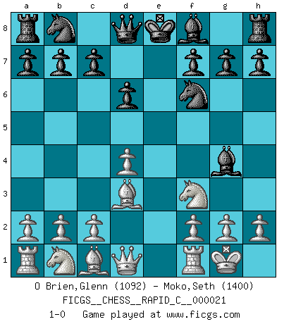 Last move : 1-0 2007 March 17 8:7:10 [Event "FICGS__CHESS__RAPID_C__000021"] [Site "FICGS"] [Date "2007.02.05"] [Round "1"] [White "O Brien,Glenn"] [Black "Moko,Seth"] [Result "1-0"] [WhiteElo "1092"] [BlackElo "1400"] 1.e4 e5 2.Nf3 Nf6 3.Nxe5 d6 4.Nf3 Nxe4 5.d4 Nf6 6.Bd3 Bg4 7.O-O 1-0 This chess game has been lost on time (started : 2007.02.05 17:57:53) Petrov : Classical attack, close variation Kingside Castling by player White (move 7) Player White won this chess game. Follow this game move after move (download)In life, as in Chess, one's own Pawns block one's way. A man's very wealth, ease, leisure, children, books, which should help him to win, more often checkmate him. (Charles Buxton) Wenn Du nicht kämpfst, um anderen etwas zu beweisen, sondern nur für Dich selbst, dann bist du fast unbesiegbar. (Garry Kasparov) El Peón aislado arroja penumbra sobre todo el tablero. (Aaron Nimzovich) Avec des compensations pour le matériel en plus... (Anonyme) To be champion requires more than simply being a strong player; one has to be a strong human being as well. (Anatoly Karpov)
