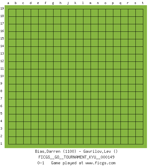 Last move : 0-1 2013 September 11 1:47:16 [Event "FICGS__GO__TOURNAMENT_KYU__000149"] [Site "FICGS"] [Date "2013.08.11"] [Round "1"] [Black "Bias,Darren"] [White "Gavrilov,Lev"] [Result "0-1"] [Rating 1 "1100"] 0-1 This go game has been lost on time (started : 2013.08.11 15:47:27) Here are the names of the openings (joseki) played in the four corners : Player White won this Go (weiqi, baduk) game. Follow this game move after move (download)Strike at the waist of the knight's move. (Anonymous) You lose, general Kenobi. (General Grievous in Star Wars ep.3)