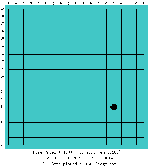 Last move : 1-0 2013 September 11 1:47:16 [Event "FICGS__GO__TOURNAMENT_KYU__000149"] [Site "FICGS"] [Date "2013.08.11"] [Round "1"] [Black "Hase,Pavel"] [White "Bias,Darren"] [Result "1-0"] [Rating 1 "0100"] [Rating 2 "1100"] 1.p6 1-0 This go game has been lost on time (started : 2013.08.11 15:47:27) Here are the names of the openings (joseki) played in the four corners : Corner q4 : p6 1-0 This joseki is unknown. A weak or weird move has probably been played in this corner. Player Black won this Go (weiqi, baduk) game. Follow this game move after move (download)Learn to play under the stones. (Anonymous) Philosophers use a language that is already deformed as though by shoes that are too tight. (Ludwig Wittgenstein)