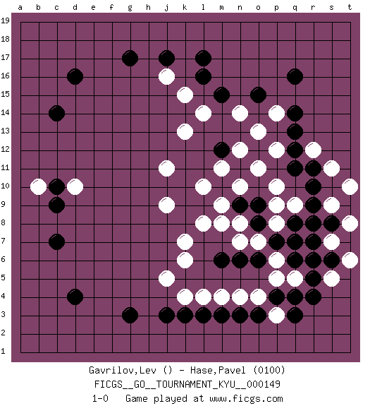 Last move : 1-0 2013 November 25 7:58:18 [Event "FICGS__GO__TOURNAMENT_KYU__000149"] [Site "FICGS"] [Date "2013.08.11"] [Round "1"] [Black "Gavrilov,Lev"] [White "Hase,Pavel"] [Result "1-0"] [Rating 2 "0100"] 1.q16 j11 2.d16 d10 3.q4 k4 4.d4 k6 5.c14 k13 6.l16 j9 7.g17 l8 8.q7 n10 9.n11 m11 10.l3 p10 11.r10 p8 12.q13 p12 13.m12 n12 14.m10 o11 15.n9 n8 16.o9 p9 17.o8 o7 18.p7 m9 19.o6 n7 20.n6 m8 21.m6 l10 22.c9 b10 23.c10 p14 24.q14 o13 25.o15 n14 26.m15 l14 27.g3 k15 28.j17 j16 29.l17 m4 30.m3 l4 31.k3 o4 32.o3 n4 33.n3 j5 34.c7 p6 35.q6 p5 36.q3 k7 37.j3 r8 38.q8 q5 39.r5 r6 40.r7 s7 41.s6 q9 42.r6 t6 43.s8 s9 44.r9 s11 45.r11 r12 46.q12 t10 47.r8 t8 48.q11 s5 49.r4 p3 50.p4 1-0 This go game has been lost on time (started : 2013.08.11 15:47:27) Here are the names of the openings (joseki) played in the four corners : Corner d16 : j11 d16 This joseki is unknown. A weak or weird move has probably been played in this corner. Corner d4 : d4 j9 Hoshi (Hwajeom, Seongjeom, Xingwei`) 4-4 Point. The star or hoshi (4-4) point, emphasizing influence at the potential expense of territory. Corner q4 : q4 l8 Hoshi (Hwajeom, Seongjeom, Xingwei`) 4-4 Point. The star or hoshi (4-4) point, emphasizing influence at the potential expense of territory. Player Black won this Go (weiqi, baduk) game. Follow this game move after move (download)On the third line, four die, six live. (Anonymous) They say in chess you've got to kill the queen, and then you mate it... Oh I, do you ? (Red Hot Chili Peppers, Fortune faded)