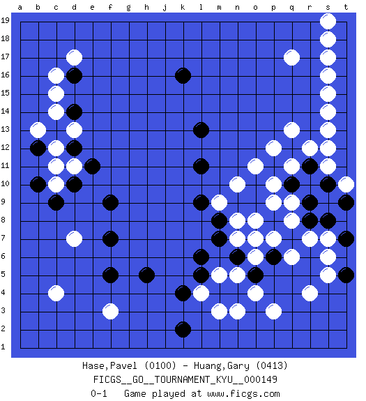 Last move : 0-1 2013 December 11 14:50:3 [Event "FICGS__GO__TOURNAMENT_KYU__000149"] [Site "FICGS"] [Date "2013.08.11"] [Round "1"] [Black "Hase,Pavel"] [White "Huang,Gary"] [Result "0-1"] [Rating 1 "0100"] [Rating 2 "0413"] 1.f5 c4 2.d10 f3 3.k4 d7 4.f7 r4 5.f9 d17 6.k16 q17 7.h5 m3 8.k2 p3 9.q10 r12 10.q12 q13 11.r11 p12 12.p11 s11 13.r9 q11 14.s10 p10 15.o10 o11 16.o9 p9 17.p8 q9 18.t9 q8 19.p6 p7 20.o7 o8 21.n9 n8 22.l9 m9 23.m7 n7 24.n6 o6 25.o5 o7 26.q7 q6 27.m8 n10 28.l11 n5 29.n4 m5 30.m4 o4 31.l6 l4 32.l5 n3 33.t11 s12 34.r8 r7 35.t12 s13 36.t13 s14 37.l13 c15 38.d12 c11 39.b12 c12 40.d14 c14 41.d16 c16 42.b10 c10 43.c13 b13 44.c9 d11 45.e11 d13 46.t14 s15 47.t15 s16 48.t16 s17 49.t17 s18 50.t18 s19 51.t19 t10 52.s8 s7 53.t7 s6 54.t5 s5 0-1 Here are the names of the openings (joseki) played in the four corners : Corner d4 : f5 c4 This joseki is unknown. A weak or weird move has probably been played in this corner. Player White won this Go (weiqi, baduk) game. Follow this game move after move (download)Add one stone, then sacrifice both. (Anonymous) Fame, I have already. Now I need the money. (an elderly Steinitz)