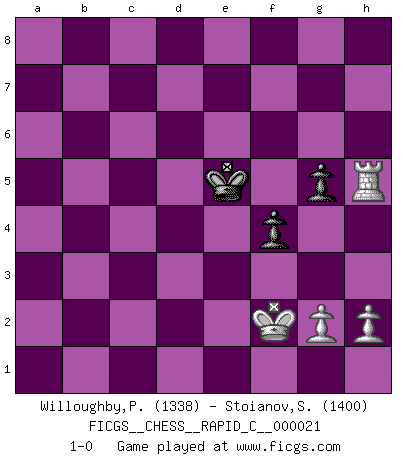 Last move : 1-0 2007 February 24 15:15:27 [Event "FICGS__CHESS__RAPID_C__000021"] [Site "FICGS"] [Date "2007.02.05"] [Round "1"] [White "Willoughby,Peter"] [Black "Stoianov,Stoian"] [Result "1-0"] [WhiteElo "1338"] [BlackElo "1400"] 1.e4 e5 2.f4 Nc6 3.Nf3 d6 4.Bb5 Bd7 5.O-O a6 6.Bxc6 Bxc6 7.Re1 exf4 8.d4 Ne7 9.Bxf4 Ng6 10.Bg3 Be7 11.d5 Bb5 12.Nc3 Qd7 13.Nxb5 Qxb5 14.b3 a5 15.c4 Qd7 16.Nd4 Bf6 17.Rb1 O-O 18.Nf5 Ne7 19.Nxe7+ Qxe7 20.a3 Bh4 21.Bxh4 Qxh4 22.e5 Rfe8 23.exd6 Rxe1+ 24.Qxe1 Qd4+ 25.Qf2 Qxf2+ 26.Kxf2 cxd6 27.b4 b6 28.bxa5 Rxa5 29.Rxb6 h6 30.Rxd6 Rxa3 31.c5 Rc3 32.Rd8+ Kh7 33.c6 Kg6 34.Rd7 Kf6 35.c7 Ke5 36.d6 Ke6 37.Rd8 f5 38.c8Q+ Rxc8 39.Rxc8 Kxd6 40.Rg8 g5 41.Rg6+ Ke5 42.Rxh6 f4 43.Rh5 1-0 King's gambit Kingside Castling by player White (move 5) Kingside Castling by player Black (move 17) Promotion Queen by player White (move 38) 10 pieces endgame at move 38 : White KRPPP , Black KRPPP WHITE : King + 1 Rook 3 Pawns BLACK : King + 1 Rook 3 Pawns 9 pieces endgame at move 39 : White KRPPP , Black KPPP WHITE : King + 1 Rook 3 Pawns BLACK : King + 3 Pawns 8 pieces endgame at move 39 : White KRPP , Black KPPP WHITE : King + 1 Rook 2 Pawns BLACK : King + 3 Pawns 7 pieces endgame at move 42 : White KRPP , Black KPP WHITE : King + 1 Rook 2 Pawns BLACK : King + 2 Pawns Player White won this chess game. Follow this game move after move (download)Chess is a foolish expedient for making idle people believe they are doing something very clever when they are only wasting their time. (George Bernard Shaw) Wer wird heute Abend ihr Gegner sein? -- Heute Abend spiele ich gegen die schwarzen Steine. (Akiba Rubinstein) El Ajedrez es tortura mental. (Garry Kasparov) La vie et les Echecs sont tous les deux une lutte constante. (Lasker) The Internet is the first thing that humanity has build that humanity doesn't understand, the largest experiment in anarchy that we have ever had. (Eric Schmidt)