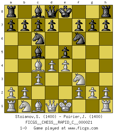 Last move : 1-0 2007 March 14 13:47:25 [Event "FICGS__CHESS__RAPID_C__000021"] [Site "FICGS"] [Date "2007.02.05"] [Round "1"] [White "Stoianov,Stoian"] [Black "Poirier,Jean Patrick"] [Result "1-0"] [WhiteElo "1400"] [BlackElo "1400"] 1.e4 e5 2.Nf3 Nc6 3.Bc4 Bc5 4.c3 Nf6 5.d4 1-0 This chess game has been lost on time (started : 2007.02.05 17:57:53) Giuoco Piano Player White won this chess game. Follow this game move after move (download)Discovered check is the dive bomber of the Chessboard. (Reuben Fine) Man kann eine Schachpartie nur gewinnen, wenn das Gleichgewicht gestört ist. In einer Stellung mit ungestörtem Gleichgewicht ist auch das größte Genie hilflos - in der Stellung steckt dann eben kein genialer Einfall. (Wilhelm Steinitz) La batalla por la última verdad nunca sera ganada. Y es por eso que el Ajedrez es tan fascinante. (Hans Kmoch) Les Echecs ont trois composantes : le temps, l'espace et le matériel en dernier. (Mikhail Tal) Now be brave and don't look back. Don't look back. (Shmi Skywalker in Star Wars ep.1)