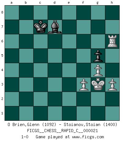 Last move : 1-0 2007 April 7 9:54:35 [Event "FICGS__CHESS__RAPID_C__000021"] [Site "FICGS"] [Date "2007.02.05"] [Round "1"] [White "O Brien,Glenn"] [Black "Stoianov,Stoian"] [Result "1-0"] [WhiteElo "1092"] [BlackElo "1400"] 1.e4 e5 2.Nf3 Nc6 3.Bb5 a6 4.Ba4 d6 5.O-O b5 6.Bb3 Nf6 7.Re1 Be7 8.c3 O-O 9.h3 Bb7 10.d4 exd4 11.cxd4 Na5 12.Bc2 c5 13.Nbd2 Re8 14.d5 Nd7 15.Nf1 Ne5 16.Nxe5 dxe5 17.Ne3 Bg5 18.Nf5 Bxc1 19.Rxc1 Nc4 20.Bb3 Nxb2 21.Qe2 c4 22.Qxb2 cxb3 23.Qxb3 Qd7 24.d6 Bxe4 25.Ne7+ Rxe7 26.dxe7 Bb7 27.Rxe5 Re8 28.Qd1 Qxd1+ 29.Rxd1 f6 30.Re2 Kf7 31.Rde1 a5 32.a3 Bd5 33.g4 g5 34.Re3 a4 35.Kh2 h6 36.Kg3 Bc6 37.f3 b4 38.axb4 a3 39.Rxa3 Rxe7 40.Rxe7+ Kxe7 41.Ra7+ Kd6 42.Ra6 Kc7 43.b5 Bxb5 44.Rxf6 Bd7 45.Rxh6 1-0 Ruy Lopez : Modern Steinitz defense, 5.O-O Kingside Castling by player White (move 5) Kingside Castling by player Black (move 8) 10 pieces endgame at move 43 : White KRPPP , Black KBPPP WHITE : King + 1 Rook 3 Pawns BLACK : King + 1 Bishop 3 Pawns 9 pieces endgame at move 44 : White KRPPP , Black KBPP WHITE : King + 1 Rook 3 Pawns BLACK : King + 1 Bishop 2 Pawns 8 pieces endgame at move 45 : White KRPPP , Black KBP WHITE : King + 1 Rook 3 Pawns BLACK : King + 1 Bishop 1 Pawn Player White won this chess game. Follow this game move after move (download)Chess is a fighting game which is purely intellectual and includes chance. (Richard Reti) Ich rechne überhaupt nicht voraus. Ich gewinne auch so. (Robert James Fischer) Muchos jugadores de Ajedrez se sorprendían cuando después de la partida, Fischer explicaba con calma: 'Yo ya había analizado esta posibilidad' en una posición en la cual yo creía que no era posible de prever desde la apertura. (Mikhail Tal) Psychologiquement, tu dois avoir confiance en toi même, mais cette confiance doit être basée sur des faits. (Robert Fischer) Over-the-board chess is the favorite of mortals, correspondence chess is the favorite of the gods. (Eduard Dyckhoff)