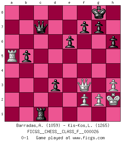 Last move : 0-1 2007 April 4 20:54:18 [Event "FICGS__CHESS__CLASS_F__000026"] [Site "FICGS"] [Date "2007.02.05"] [Round "1"] [White "Barradas,Anderson"] [Black "Kis-Kos,Laszlo"] [Result "0-1"] [WhiteElo "1059"] [BlackElo "1265"] 1.d4 Nf6 2.Nc3 d5 3.Bg5 e6 4.Nf3 Be7 5.e3 O-O 6.Bd3 h6 7.Bf4 Nh5 8.O-O Nxf4 9.exf4 c5 10.dxc5 Bxc5 11.a3 Nc6 12.b4 Bd6 13.Nb5 a6 14.Nxd6 Qxd6 15.Ne5 Nxe5 16.fxe5 Qxe5 17.Re1 Qd6 18.c3 Bd7 19.a4 Rfc8 20.Qc2 Rc7 21.b5 axb5 22.axb5 Rac8 23.Rec1 d4 24.c4 Bxb5 25.Qb2 Bxc4 26.Bxc4 Rxc4 27.Rxc4 Rxc4 28.Qb3 Qc6 29.Qb1 b5 30.h3 Qd5 31.Ra5 Rc5 32.Qb2 d3 33.Qd2 Rc2 34.Qd1 Qc4 35.Qf3 Rc1+ 36.Kh2 Qc7+ 0-1 Queen's pawn game Kingside Castling by player Black (move 5) Kingside Castling by player White (move 8) Player Black won this chess game. Follow this game move after move (download)Man is a frivolous, a specious creature, and like a Chess player, cares more for the process of attaining his goal than for the goal itself. (Dostoyevsky) Es ist wirklich schade, dass so viele Schachspieler nicht auf ihr Äußeres achten! (Alexandra Kosteniuk) Cuando tengas duda... ¡juega al Ajedrez!. (Tevis) En blitz, le Cavalier l'emporte sur le Fou. (Vlastimil Hort) The best teachers teach from the heart, not from the book. (Author unknown)
