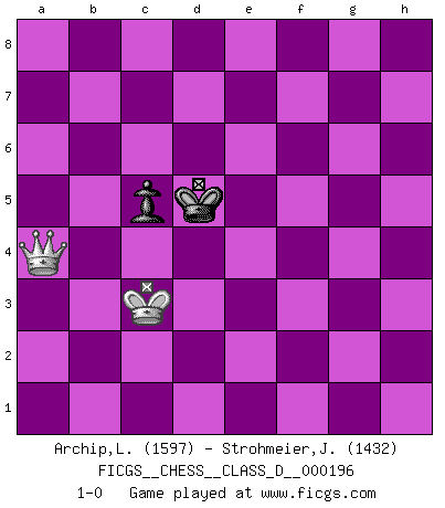 Last move : 1-0 2014 March 14 21:57:59 [Event "FICGS__CHESS__CLASS_D__000196"] [Site "FICGS"] [Date "2013.08.16"] [Round "1"] [White "Archip,Laurentiu"] [Black "Strohmeier,Josef"] [Result "1-0"] [WhiteElo "1597"] [BlackElo "1432"] 1.c4 Nf6 2.d4 e6 3.Nf3 b6 4.Nc3 Bb7 5.e3 d5 6.cxd5 Nxd5 7.Nxd5 Bxd5 8.Be2 Bb4+ 9.Bd2 Bxd2+ 10.Qxd2 O-O 11.O-O Nd7 12.Rfc1 c5 13.dxc5 Nxc5 14.Rd1 Ne4 15.Qb4 Rc8 16.Rac1 Rxc1 17.Rxc1 h6 18.Ne5 Nc5 19.Nd3 Nxd3 20.Bxd3 Qb8 21.Be4 Bxe4 22.Qxe4 Rc8 23.Rc6 Qb7 24.Rxc8+ Qxc8 25.g4 Qc1+ 26.Kg2 Qc7 27.h4 Qe7 28.h5 a5 29.a4 Qc5 30.Qd3 Qc6+ 31.Kg3 Qc7+ 32.f4 Qb7 33.Qd8+ Kh7 34.Qd3+ Kg8 35.Qd8+ Kh7 36.Qd3+ g6 37.hxg6+ fxg6 38.Qd4 Qc7 39.b4 axb4 40.Qxb4 Kg7 41.Qb5 Kf7 42.Kh4 Ke7 43.Qb4+ Qc5 44.Qxc5+ bxc5 45.Kg3 Kd6 46.Kf3 Kc6 47.Ke4 Kb6 48.Kd3 h5 49.gxh5 gxh5 50.e4 h4 51.f5 exf5 52.exf5 h3 53.f6 h2 54.f7 h1Q 55.f8Q Qd1+ 56.Kc3 Qxa4 57.Qb8+ Kc6 58.Qe8+ Kd5 59.Qxa4 1-0 English, 1...Nf6 (Anglo-Indian defense) Kingside Castling by player Black (move 10) Kingside Castling by player White (move 11) 10 pieces endgame at move 44 : White KPPPP , Black KPPPP WHITE : King + 4 Pawns BLACK : King + 4 Pawns 9 pieces endgame at move 49 : White KPPPP , Black KPPP WHITE : King + 4 Pawns BLACK : King + 3 Pawns 8 pieces endgame at move 49 : White KPPP , Black KPPP WHITE : King + 3 Pawns BLACK : King + 3 Pawns 7 pieces endgame at move 51 : White KPP , Black KPPP WHITE : King + 2 Pawns BLACK : King + 3 Pawns 6 pieces endgame at move 52 : White KPP , Black KPP WHITE : King + 2 Pawns BLACK : King + 2 Pawns Promotion Queen by player Black (move 54) Promotion Queen by player White (move 55) 5 pieces endgame at move 56 : White KQ , Black KQP WHITE : King + 1 Queen BLACK : King + 1 Queen 1 Pawn 4 pieces endgame at move 59 : White KQ , Black KP WHITE : King + 1 Queen BLACK : King + 1 Pawn Player White won this chess game. Follow this game move after move (download)Chess problems demand from the composer the same virtues that characterize all worthwhile art: originality, invention, conciseness, harmony, complexity, and splendid insincerity. (Vladimir Nabokov) Ich würde mich als ganz normalen Jungen bezeichnen [Im Alter von 12]. (Sergej Karjakin) Juega la Apertura como un libro, el Juego Medio como un mago y los Finales como una máquina. (Spielmann) Lorsque vous vous retrouvez devant une position atroce, ne tendez pas un ultime piège dérisoire avec l'intention d'abandonner si l'adversaire le déjoue ! Faites-vous plutôt un devoir de résister comme si votre vie en dépendait. Jouez le coup qui vous déplairait au centuple si vous étiez dans la peau de votre tortionnaire ! There are two kinds of tragedy in this world, one is not getting what you want and the other is getting. (Lord of war)