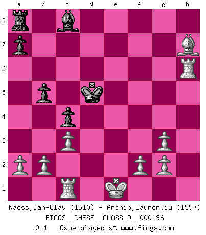 Last move : 0-1 2013 December 11 9:15:6 [Event "FICGS__CHESS__CLASS_D__000196"] [Site "FICGS"] [Date "2013.08.16"] [Round "1"] [White "Naess,Jan-Olav"] [Black "Archip,Laurentiu"] [Result "0-1"] [WhiteElo "1510"] [BlackElo "1597"] 1.d4 d5 2.Nf3 Nf6 3.Bg5 h6 4.Bh4 g5 5.Bg3 Nbd7 6.e3 Ne4 7.Bd3 Nxg3 8.hxg3 Nf6 9.Nbd2 e6 10.c3 c5 11.Rc1 c4 12.Bb1 b5 13.Nxg5 Ng4 14.Nxf7 Kxf7 15.Qxg4 Qf6 16.Nf3 Bd6 17.e4 e5 18.Qh5+ Ke7 19.dxe5 Bxe5 20.Qxe5+ Qxe5 21.Nxe5 Rh7 22.exd5 Kd6 23.Bxh7 Kxe5 24.Rxh6 Kxd5 0-1 Torre attack (Tartakower variation) Player Black won this chess game. Follow this game move after move (download)It began to feel as though you were playing against Chess itself. - On playing against Robert Fischer. (Walter Shipman) Um sich vor der Gefahr einer Erkältung zu schützen, sorge der wanderlustige König beizeiten für ein brauchbares Versteck. (Aaron Nimzowitsch) Tu cuerpo tiene que estar en óptima condición. Tu Ajedrez se deteriora como lo hace tu cuerpo. No puedes separar la mente y el cuerpo. (Bobby Fischer) Le système Elo représente seulement une moyenne. Il est simplement un indicateur de votre stabilité. (Anatoli Karpov) The general who wins the battle makes many calculations in his temple before the battle is fought. The general who loses makes but few calculations beforehand. (Sun Tzu)
