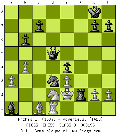 Last move : 0-1 2013 August 23 20:19:38 [Event "FICGS__CHESS__CLASS_D__000196"] [Site "FICGS"] [Date "2013.08.16"] [Round "1"] [White "Archip,Laurentiu"] [Black "Voveris,Saulius"] [Result "0-1"] [WhiteElo "1597"] [BlackElo "1429"] 1.c4 e5 2.Nc3 Nc6 3.e3 d6 4.Nf3 f5 5.d3 Nf6 6.a3 Be7 7.Be2 O-O 8.O-O d5 9.cxd5 Nxd5 10.Qb3 Be6 11.Nxd5 Bxd5 12.Qxb7 Rb8 13.Qa6 Rb6 14.Qxb6 axb6 15.b4 e4 16.dxe4 fxe4 17.Nd2 Bf6 18.Bc4 Bxa1 19.Bxd5+ Qxd5 20.Rd1 Ne5 21.Kf1 Nd3 22.Ke2 Rxf2+ 0-1 English : Sicilian Reversed Kingside Castling by player Black (move 7) Kingside Castling by player White (move 8) Player Black won this chess game. Follow this game move after move (download)Fischer is completely natural. He plays no roles. He's like a child. Very, very simple. (Zita Rajcsanyi) Die Leute spielen gegen mich seit 15 Jahren unter Ihren Möglichkeiten. (Robert James Fischer) Si el ingenio solamente fuese necesario para lucirse, las mujeres serían las mejores jugadoras de Ajedrez del mundo. (Albin) Les échecs, c'est l'art d'analyser. (Mikhail Botvinnik) See no evil, hear no evil, speak no evil. (The 3 monkeys)