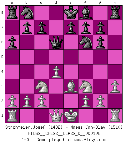 Last move : 1-0 2013 October 30 17:10:28 [Event "FICGS__CHESS__CLASS_D__000196"] [Site "FICGS"] [Date "2013.08.16"] [Round "1"] [White "Strohmeier,Josef"] [Black "Naess,Jan-Olav"] [Result "1-0"] [WhiteElo "1432"] [BlackElo "1510"] 1.e4 d5 2.exd5 Qxd5 3.Nc3 Qd6 4.d4 Nf6 5.Nf3 a6 6.h3 Bf5 7.Bd3 Bg6 8.Bxg6 hxg6 9.Be3 1-0 This chess game has been lost on time (started : 2013.08.16 1:16:9) Scandinavian : Pytel-Wade variation Player White won this chess game. Follow this game move after move (download)A good player is always lucky. (Jose Raul Capablanca) Kein Großmeister ist normal. Sie unterscheiden sich nur im Ausmaß Ihrer Verrücktheit. (Viktor Kortschnoi) Tu sabes, camarada Pachman, no disfruto el ser un Ministro, preferería jugar al Ajedrez como tu. (Che Guevara) Toute estimation doit être constamment réévaluée. (Jacob Estrin) God is an atheist. (Unknown)