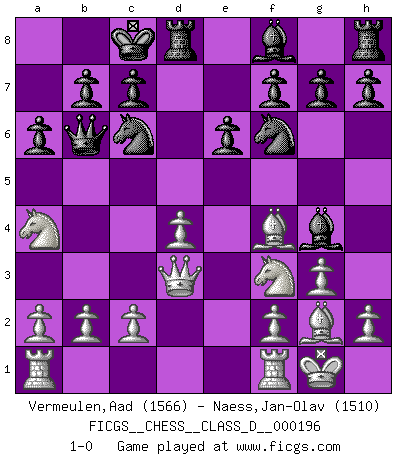 Last move : 1-0 2014 January 8 10:42:46 [Event "FICGS__CHESS__CLASS_D__000196"] [Site "FICGS"] [Date "2013.08.16"] [Round "1"] [White "Vermeulen,Aad"] [Black "Naess,Jan-Olav"] [Result "1-0"] [WhiteElo "1566"] [BlackElo "1510"] 1.e4 d5 2.exd5 Qxd5 3.Nc3 Qd6 4.d4 Nf6 5.Nf3 a6 6.g3 Bg4 7.Bg2 e6 8.Bf4 Qb6 9.Qd3 Nc6 10.O-O O-O-O 11.Na4 1-0 This chess game has been lost on time (started : 2013.08.16 1:16:9) Scandinavian : Pytel-Wade variation Kingside Castling by player White (move 10) Queenside Castling by player Black (move 10) Player White won this chess game. Follow this game move after move (download)Chess is 99 percent tactics. (Teichmann) Es war undenkbar für die Behörden, dass ein sowjetischer Großmeister auf diese Art und Weise [Fischer-Taimanov 6:0] verliert, ohne dass es eine politischer Erklärung dafür gäbe. (Mark Taimanov) Me gusta decir que Bobby Fischer fue el mejor jugador que jamás haya existido. Pero lo que hizo de Fischer un genio, fue su habilidad de mezclar una frescura y pragmatismo Americano con ideas Rusas acerca de la estrategia. (Bruce Pandolfini) La vie est comme un jeu d'échecs : nous esquissons un plan, mais celui-ci est tributaire de ce que daignent faire l'adversaire aux échecs et le destin dans la vie. (Arthur Schopenhauer) What doesn't kill us makes us stronger. (Friedrich Nietzsche)