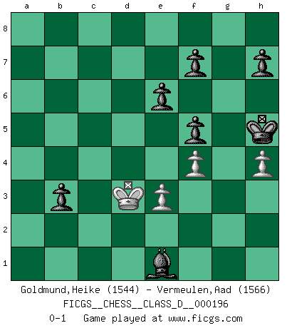 Last move : 0-1 2014 January 14 22:41:13 [Event "FICGS__CHESS__CLASS_D__000196"] [Site "FICGS"] [Date "2013.08.16"] [Round "1"] [White "Goldmund,Heike"] [Black "Vermeulen,Aad"] [Result "0-1"] [WhiteElo "1544"] [BlackElo "1566"] 1.Nf3 d5 2.d4 Nf6 3.e3 e6 4.c4 c5 5.Nbd2 Nc6 6.Nb3 cxd4 7.Nbxd4 Bd7 8.Nxc6 Bxc6 9.b3 dxc4 10.Qxd8+ Rxd8 11.Bxc4 Be7 12.O-O O-O 13.Bb2 Bd5 14.Nd2 Bxg2 15.Rfd1 Bc6 16.f3 Bb4 17.Bxf6 gxf6 18.Kf2 Rxd2+ 19.Rxd2 Bxd2 20.Ke2 Ba5 21.Rg1+ Kh8 22.a3 a6 23.b4 Bc7 24.Rg2 Rg8 25.Kf2 Rxg2+ 26.Kxg2 f5 27.h3 Kg7 28.Bb3 Kf6 29.a4 Ke5 30.Kf2 Bd5 31.Bd1 b5 32.f4+ Kf6 33.Ke2 Bd6 34.Kd3 Bxb4 35.axb5 axb5 36.Kd4 Be1 37.Be2 b4 38.Bf1 b3 39.Bd3 Be4 40.Kc4 Bxd3+ 41.Kxd3 Kg6 42.h4 Kh5 0-1 Reti Opening Kingside Castling by player White (move 12) Kingside Castling by player Black (move 12) Player Black won this chess game. Follow this game move after move (download)Before the endgame, the Gods have placed the middle game. (Siegbert Tarrasch) Es hat in meinem Leben Zeiten gegeben, da ich sehr nahe daran war zu glauben, daß ich auch nicht eine einzige Schachpartie verlieren könnte. (José Raúl Capablanca) Mis oponentes también hacen buenas movidas. A veces yo no tomo esas cosas en consideración. (Bobby Fischer) Le jeu d'échecs est comme rejeté hors du temps. (Antoine de Saint-Exupéry) All war is based on deception. (Sun Tzu)