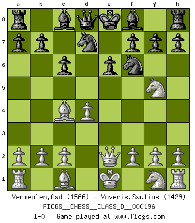 Last move : 1-0 2013 October 6 15:21:34 [Event "FICGS__CHESS__CLASS_D__000196"] [Site "FICGS"] [Date "2013.08.16"] [Round "1"] [White "Vermeulen,Aad"] [Black "Voveris,Saulius"] [Result "1-0"] [WhiteElo "1566"] [BlackElo "1429"] 1.e4 c6 2.d4 d5 3.Nc3 dxe4 4.Nxe4 Nd7 5.Ng5 Ngf6 6.Bc4 e6 7.Qe2 1-0 This chess game has been lost on time (started : 2013.08.16 1:16:9) Caro-Kann : Steinitz variation Player White won this chess game. Follow this game move after move (download)Not only will I predict his triumph over Botvinnik, but I'll go further and say that he'll probably be the greatest Chess player that ever lived. (John Collins) Jeder leidlich begabte Spieler, er braucht keineswegs hervorragend veranlagt zu sein, kann es zum Meister bringen. Aber das ist ja auch gar nicht nötig! Der richtige Standpunkt ist es, zu seinem Vergnügen zu spielen, und man glaube ja nicht, dass der Genuss proportional dem Können sei. (Siegbert Tarrasch) ¿Que sería del Ajedrez sin errores graciosos?. (Kurt Richter) Que feriez-vous si vous étiez en train de jouer aux échecs et que la fin du monde arrive ? Je continuerais à jouer. (Saint Borromée) He who laughs last probably does not get the joke. (Unknown)
