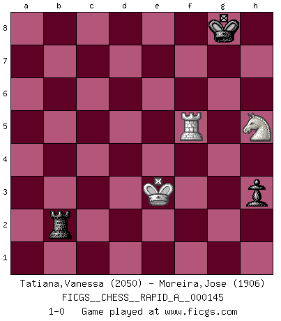 Last move : 1-0 2013 October 4 14:34:56 [Event "FICGS__CHESS__RAPID_A__000145"] [Site "FICGS"] [Date "2013.08.17"] [Round "1"] [White "Tatiana,Vanessa"] [Black "Moreira,Jose"] [Result "1-0"] [WhiteElo "2050"] [BlackElo "1906"] 1.e4 c5 2.Nf3 d6 3.d4 cxd4 4.Nxd4 Nf6 5.Nc3 a6 6.Be3 e5 7.Nb3 Be6 8.f3 Be7 9.Qd2 O-O 10.O-O-O Nbd7 11.g4 b5 12.g5 b4 13.Ne2 Ne8 14.f4 a5 15.f5 a4 16.fxe6 axb3 17.cxb3 fxe6 18.Bh3 Nc7 19.Kb1 d5 20.exd5 exd5 21.Bg2 Ra5 22.a4 Qe8 23.Rc1 Qg6+ 24.Qc2 Qxc2+ 25.Rxc2 Nc5 26.Rhc1 d4 27.Bxd4 Nxb3 28.Bb6 Rxa4 29.Rxc7 Ra1+ 30.Kc2 Nxc1 31.Nxc1 Bd8 32.Bd5+ Kh8 33.Rb7 Bxb6 34.Rxb6 Rc8+ 35.Bc6 e4 36.Ne2 Ra5 37.Kd2 Rxg5 38.Bxe4 Rh5 39.Rxb4 Rxh2 40.Ke3 g5 41.Ng3 Rh3 42.Kf2 Re8 43.Bf5 Rh2+ 44.Kf3 h5 45.Rb6 Rf8 46.Ke4 h4 47.Nh5 Re2+ 48.Kd3 Rxb2 49.Rh6+ Kg8 50.Be6+ Rf7 51.Rg6+ Kf8 52.Bxf7 Kxf7 53.Rg7+ Kf8 54.Rxg5 h3 55.Rf5+ Kg8 56.Ke3 1-0 Sicilian : Najdorf, Byrne (English) attack Kingside Castling by player Black (move 9) Queenside Castling by player White (move 10) 10 pieces endgame at move 39 : White KRBNP , Black KRRPP WHITE : King + 1 Rook 1 Bishop 1 Knight 1 Pawn BLACK : King + 2 Rooks 2 Pawns 9 pieces endgame at move 48 : White KRBN , Black KRRPP WHITE : King + 1 Rook 1 Bishop 1 Knight BLACK : King + 2 Rooks 2 Pawns 8 pieces endgame at move 52 : White KRBN , Black KRPP WHITE : King + 1 Rook 1 Bishop 1 Knight BLACK : King + 1 Rook 2 Pawns 7 pieces endgame at move 52 : White KRN , Black KRPP WHITE : King + 1 Rook 1 Knight BLACK : King + 1 Rook 2 Pawns 6 pieces endgame at move 54 : White KRN , Black KRP WHITE : King + 1 Rook 1 Knight BLACK : King + 1 Rook 1 Pawn Player White won this chess game. Follow this game move after move (download)The Chess pieces are the block alphabet which shapes thoughts; and these thoughts, although making a visual design on the chessboard, express their beauty abstractly, like a poem. (Marcel Duchamp) Mein Gehirn das ist mein zweitwichtigstes Organ [Aus dem Film: Der Schläfer]. (Woody Allen) No hay un Gran Maestro de Ajedrez que sea normal; solo se diferencían ellos por la magnitud de su locura. (Viktor Korchnoi) Karpov est une pièce de musée. (Garry Kasparov) They say poker is a zero-sum game. It must be, because every time I play my sum ends up zero. (Max Shapiro)