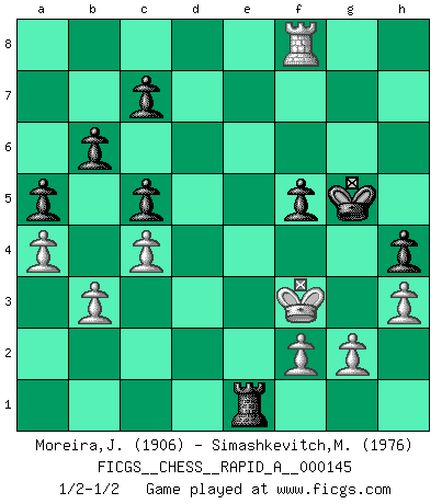 Last move : 1/2-1/2 2013 September 21 1:38:29 [Event "FICGS__CHESS__RAPID_A__000145"] [Site "FICGS"] [Date "2013.08.17"] [Round "1"] [White "Moreira,Jose"] [Black "Simashkevitch,Mykola"] [Result "1/2-1/2"] [WhiteElo "1906"] [BlackElo "1976"] 1.e4 e5 2.Nf3 Nc6 3.Bb5 Nf6 4.O-O Nxe4 5.d4 Nd6 6.Bxc6 dxc6 7.dxe5 Nf5 8.Qxd8+ Kxd8 9.Nc3 Ke8 10.Rd1 Ne7 11.h3 Ng6 12.b3 Be7 13.Ne2 f6 14.Bb2 Kf7 15.Ng3 Re8 16.exf6 Bxf6 17.Bxf6 gxf6 18.Rd2 c5 19.Rad1 a5 20.a4 Ra6 21.Kh2 Nf4 22.Nf1 Rae6 23.Ne3 Re4 24.Ng1 h6 25.c3 b6 26.c4 R4e7 27.Ne2 Nxe2 28.Rxe2 h5 29.Red2 h4 30.Rd8 Be6 31.Kg1 Kg6 32.Rxe8 Rxe8 33.Kf1 Kg5 34.Rd3 Re7 35.Rd8 f5 36.Nd5 Bxd5 37.Rxd5 Kf4 38.Rd8 Rh7 39.Rg8 Re7 40.Rg6 Ke4 41.Ke2 Rh7 42.Rg8 Re7 43.Rh8 Kf4 44.Kd3 Kg5 45.Kd2 Rg7 46.Ke3 Re7+ 47.Kf3 Re1 48.Rg8+ Kf6 49.Rf8+ Kg5 50.Rg8+ Kf6 51.Rf8+ Kg5 1/2-1/2 Ruy Lopez : Berlin defense, Open variation Kingside Castling by player White (move 4) This chess game ended in a draw. Follow this game move after move (download)I played Chess with him and would have beaten him sometimes only he always took back his last move, and ran the game out differently. (Mark Twain) Mit sehr nachdenklichem Gesicht schreitet Bobby durch den Turniersaal. Was ist passiert?, fragt Lombardy. Ich stehe schlecht, antwortet Fischer. Lombardy: Dann biete doch einfach Remis an. Fischer: So schlecht stehe ich nun auch wieder nicht! (Robert James Fischer) Me dio la sensación de como si yo estuviera jugando en contra del mismo Ajedrez. - al estar jugando en contra de Robert Fischer (Walter Shipman) Celui qui prend des risques peut perdre, celui qui n'en prend pas perd toujours. (Xavier Tartacover) If you work for a living, why do you kill yourself working ? (Tuco to a chicken in The Good, The Bad and The Ugly)