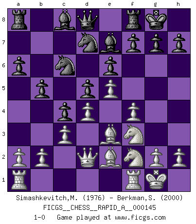 Last move : 1-0 2013 November 4 5:58:28 [Event "FICGS__CHESS__RAPID_A__000145"] [Site "FICGS"] [Date "2013.08.17"] [Round "1"] [White "Simashkevitch,Mykola"] [Black "Berkman,Sam"] [Result "1-0"] [WhiteElo "1976"] [BlackElo "2000"] 1.e4 e6 2.d4 d5 3.Nc3 Nf6 4.e5 Nfd7 5.f4 c5 6.Nf3 Nc6 7.Be3 Qc7 8.Nb5 Qa5+ 9.Qd2 Qd8 10.Be2 a6 11.Nc3 Be7 12.O-O O-O 13.Nd1 b5 14.Nf2 c4 15.c3 1-0 This chess game has been lost on time (started : 2013.08.17 8:0:21) French : Steinitz, Boleslavsky variation Kingside Castling by player White (move 12) Kingside Castling by player Black (move 12) Player White won this chess game. Follow this game move after move (download)On the chessboard, lies and hypocrisy do not survive long. (Emanuel Lasker) Mein Name ist Rustam Kamsky. Sie haben meinen Sohn belästigt. Bereiten Sie sich aufs Sterben vor. (Rustam Kamsky) Realmente no sabemos como el juego fue inventado, aunque hay sospechas. Tan pronto como descubramos a los culpables, se los haremos saber. (Bruce Pandolfini) À la honte des hommes, on sait que les lois du jeu sont les seules qui soient partout justes, claires, inviolables et exécutées. Pourquoi l'Indien qui a donné les règles du jeu d'échecs est-il obéi de bon gré dans toute la terre, et que les décrétales des papes, par exemple, sont aujourd'hui un objet d'horreur et de mépris ? C'est que l'inventeur des échecs combina tout avec justesse pour la satisfaction des joueurs, et que les papes, dans leurs décrétales, n'eurent en vue que leur seul avantage. L'Indien voulut exercer également l'esprit des hommes et leur donner du plaisir; les papes ont voulu abrutir l'esprit des hommes. Voltaire (Dictionnaire philosophique / Garnier 1967) Somehow our devils are never quite what we expect when we meet them face to face. (Nelson DeMille)