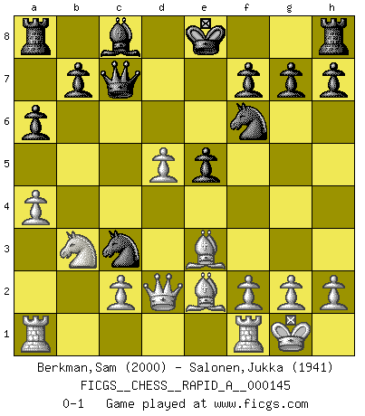 Last move : 0-1 2013 November 1 17:34:25 [Event "FICGS__CHESS__RAPID_A__000145"] [Site "FICGS"] [Date "2013.08.17"] [Round "1"] [White "Berkman,Sam"] [Black "Salonen,Jukka"] [Result "0-1"] [WhiteElo "2000"] [BlackElo "1941"] 1.e4 c5 2.Nf3 d6 3.d4 cxd4 4.Nxd4 Nf6 5.Nc3 a6 6.Be3 e5 7.Nf3 Nbd7 8.a4 Qa5 9.Nd2 d5 10.Nb3 Qc7 11.exd5 Bb4 12.Be2 Ne4 13.O-O Bxc3 14.bxc3 Nxc3 15.Qd2 Nf6 0-1 Sicilian : Najdorf, Byrne (English) attack Kingside Castling by player White (move 13) Player Black won this chess game. Follow this game move after move (download)You need not play well - just help your opponent to play badly. (Genrikh Chepukaitis) Wenn man heute mit 14 Jahren noch kein GM ist, kann man es vergessen. (Viswanathan Anand) Por la belleza de sus partidas, la claridad de su juego y lo brillante de sus ideas, Fischer se creó el mismo como un artista de la misma estatura como Brahms, Rembrandt y Shakespeare. (David Levy) Je ne suis pas le dernier à jouer lâchement des coups douteux pendant le zeïtnot de l'adversaire pour l'achever: en effet les coups qui font le plus peur sont ceux que l'on ne comprend pas. Je me fais souvent peur quand je joue. (Un professeur anonyme) Shallow men believe in luck. Strong men belive in cause and effect. (Ralph Waldo Emerson)