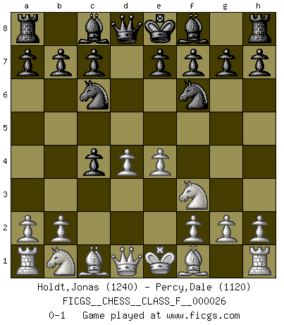 Last move : 0-1 2007 March 20 7:32:47 [Event "FICGS__CHESS__CLASS_F__000026"] [Site "FICGS"] [Date "2007.02.05"] [Round "1"] [White "Holdt,Jonas"] [Black "Percy,Dale"] [Result "0-1"] [WhiteElo "1240"] [BlackElo "1120"] 1.d4 d5 2.c4 dxc4 3.e4 Nc6 4.Nf3 Nf6 0-1 This chess game has been lost on time (started : 2007.02.05 18:9:52) QGA : 3.e4 Player Black won this chess game. Follow this game move after move (download)For me, Chess is life and every game is like a new life. Every Chess player gets to live many lives in one lifetime. (Eduard Gufeld) Ich kämpfe solange mein Gegner einen Fehler machen kann. (Emanuel Lasker) Hasta este punto, las blancas han seguido un análisis bien conocido. Pero ahora el hace un error fatal: empieza a usar su propia cabeza. (Siegbert Tarrasch) Si le désir cupide (et stupide) de gagner est une inépuisable source de souffrance, une combinaison brillante sur l'échiquier est une découverte : le coquelicot qui s'épanouit lorsque apparaît la Voie Lactée. (Arrabal) The large trees attract high winds. (Chinese proverb)
