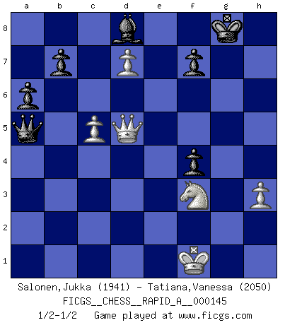 Last move : 1/2-1/2 2013 September 24 1:20:7 [Event "FICGS__CHESS__RAPID_A__000145"] [Site "FICGS"] [Date "2013.08.17"] [Round "1"] [White "Salonen,Jukka"] [Black "Tatiana,Vanessa"] [Result "1/2-1/2"] [WhiteElo "1941"] [BlackElo "2050"] 1.e4 c5 2.Nf3 d6 3.d4 cxd4 4.Nxd4 Nf6 5.Nc3 a6 6.Be3 e5 7.Nf3 Qc7 8.a4 Be7 9.Be2 O-O 10.O-O h6 11.a5 Be6 12.Nd5 Nxd5 13.exd5 Bf5 14.c4 Nd7 15.b4 Rac8 16.Nd2 Qd8 17.f4 exf4 18.Bxf4 Bg6 19.Nf3 Bf6 20.Ra2 Qe7 21.Ra3 Rfe8 22.Re1 Qf8 23.Qd2 Bh7 24.Bg3 g5 25.h3 Bg7 26.Re3 Rxe3 27.Qxe3 Re8 28.Qb3 Nf6 29.Bd3 Rxe1+ 30.Bxe1 Qe7 31.Bxh7+ Kxh7 32.Qd3+ Kg8 33.g4 h5 34.gxh5 Nxh5 35.Bd2 Nf4 36.Bxf4 gxf4 37.c5 dxc5 38.d6 Qd8 39.bxc5 Qxa5 40.d7 Bf6 41.Qd5 Bd8 42.Kf1 1/2-1/2 Sicilian : Najdorf, Byrne (English) attack Kingside Castling by player Black (move 9) Kingside Castling by player White (move 10) This chess game ended in a draw. Follow this game move after move (download)Excellence at Chess is one mark of a scheming mind. (Sir Arthur Conan Doyle) Das Schachspiel hat wie die Liebe, die Musik, die Fähigkeit, den Menschen glücklich zu machen. Ich habe ein leises Gefühl des Bedauerns für jeden, der das Schachspiel nicht kennt, so wie ich jeden bedaure, der die Liebe nicht kennt. (Siegbert Tarrasch) El pensamiento metódico es mas útil en el Ajedrez que la inspiración. (C. J. S. Purdy) Avec des compensations pour le matériel en plus... (Anonyme) No, I am still playing. (Anatoly Karpov)