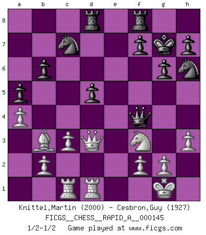 Last move : 1/2-1/2 2013 October 24 13:1:25 [Event "FICGS__CHESS__RAPID_A__000145"] [Site "FICGS"] [Date "2013.08.17"] [Round "1"] [White "Knittel,Martin"] [Black "Cesbron,Guy"] [Result "1/2-1/2"] [WhiteElo "2000"] [BlackElo "1927"] 1.e4 d6 2.d4 Nf6 3.Nc3 g6 4.Nf3 Bg7 5.Be2 O-O 6.O-O Bg4 7.h3 Bxf3 8.Bxf3 Nc6 9.Ne2 e5 10.c3 Kh8 11.Qb3 b6 12.Rd1 Qd7 13.Qc2 Ng8 14.Be3 Bh6 15.Bxh6 Nxh6 16.Ng3 Kg7 17.a4 a5 18.Be2 Qe7 19.Bb5 Nd8 20.dxe5 Qxe5 21.Ne2 c6 22.Bd3 Ne6 23.Nd4 Rac8 24.Nf3 Qf4 25.Qb3 Rb8 26.Qc4 Rbc8 27.Qa6 Rb8 28.Bc2 d5 29.exd5 cxd5 30.Bb3 Nc7 31.Qd3 Rbd8 32.Rac1 1/2-1/2 Pirc : Classical system, 5.Be2 Kingside Castling by player Black (move 5) Kingside Castling by player White (move 6) This chess game ended in a draw. Follow this game move after move (download)What is the difference between chess and football? Everybody understands football, but nobody plays it. Everybody plays chess, but nobody understands it. Everything is relative. (Vladimir Kramnik) Man wirke der falschen Auffassung entgegen, als ob jeder Zug Unmittelbares zu leisten habe; auch Werte- und Ruhezüge haben ihre Existenzberechtigung. (Aaron Nimzowitsch) Yo he agregado estos principios a la ley: pongan los Caballos en acción antes de que los dos Alfiles sean desarrollados. (Emanuel Lasker) Aidez vos pièces, elles vous aideront. (Paul Morphy) A good programmer is someone who always looks both ways before crossing a one-way street. (Doug Linder)