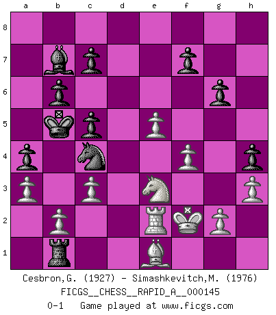 Last move : 0-1 2013 October 28 0:29:28 [Event "FICGS__CHESS__RAPID_A__000145"] [Site "FICGS"] [Date "2013.08.17"] [Round "1"] [White "Cesbron,Guy"] [Black "Simashkevitch,Mykola"] [Result "0-1"] [WhiteElo "1927"] [BlackElo "1976"] 1.e4 e5 2.Nf3 Nc6 3.Bb5 Nf6 4.O-O Nxe4 5.d4 Nd6 6.Bxc6 dxc6 7.dxe5 Nf5 8.Qxd8+ Kxd8 9.Nc3 Ke8 10.h3 h5 11.Bf4 Be7 12.Rad1 Be6 13.Ng5 Rh6 14.Rfe1 Bb4 15.Nge4 Rg6 16.Kh2 b6 17.a3 Bxc3 18.Nxc3 Rd8 19.Rxd8+ Kxd8 20.f3 h4 21.Kg1 c5 22.Kf2 Nd4 23.Rd1 Kc8 24.Rd2 Nc6 25.Nd1 Kb8 26.Ne3 a5 27.Bh2 Rh6 28.f4 Rh5 29.c3 Kb7 30.Kf3 g6 31.Ng4 a4 32.Bg1 Ka6 33.Bf2 Rh8 34.Nf6 Na5 35.Ne4 Kb5 36.Nf6 Nc4 37.Re2 Bc8 38.Be1 Bb7+ 39.Kf2 Rd8 40.Ng4 Rd1 41.Ne3 Rb1 0-1 Ruy Lopez : Berlin defense, Open variation Kingside Castling by player White (move 4) Player Black won this chess game. Follow this game move after move (download)Life is like a game of Chess, changing with each move. (Chinese proverb) Die Leute spielen gegen mich seit 15 Jahren unter Ihren Möglichkeiten. (Robert James Fischer) El Ajedrez es de 30 a 40 por ciento psicología. Uno no cuenta con esto cuando se juega contra una computadora. No lo puedo confundir. (Judith Polgar) Que feriez-vous si vous étiez en train de jouer aux échecs et que la fin du monde arrive ? Je continuerais à jouer. (Saint Borromée) I would love to change the world, but they won't give me the source code. (Unknown)
