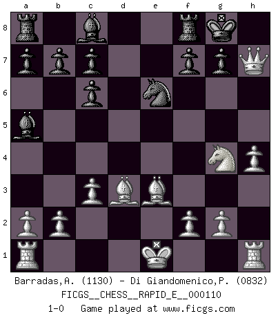 Last move : 1-0 2013 August 25 23:42:43 [Event "FICGS__CHESS__RAPID_E__000110"] [Site "FICGS"] [Date "2013.08.17"] [Round "1"] [White "Barradas,Anderson"] [Black "Di Giandomenico,Pierino"] [Result "1-0"] [WhiteElo "1130"] [BlackElo "0832"] 1.e4 e5 2.Nf3 Nf6 3.Nxe5 Nxe4 4.Qe2 Bd6 5.d4 Ng5 6.h4 Ne6 7.Nc3 Nxd4 8.Qe4 Ne6 9.Be3 Qf6 10.Ng4 Qe7 11.Nd5 Bb4+ 12.c3 Ba5 13.Nxe7 Nc6 14.Nxc6 dxc6 15.Bd3 O-O 16.Qxh7+ 1-0 Petrov : Damiano variation Kingside Castling by player Black (move 15) Player White won this chess game. Follow this game move after move (download)There are tough players and nice guys, and I'm a tough player. (Bobby Fischer) Jeder leidlich begabte Spieler, er braucht keineswegs hervorragend veranlagt zu sein, kann es zum Meister bringen. Aber das ist ja auch gar nicht nötig! Der richtige Standpunkt ist es, zu seinem Vergnügen zu spielen, und man glaube ja nicht, dass der Genuss proportional dem Können sei. (Siegbert Tarrasch) ¿Que sería del Ajedrez sin errores graciosos?. (Kurt Richter) On entre au jeu d'Echecs comme on entre en Religion. Pour le joueur d'Echecs, la partie d'Echecs c'est l'office, la messe, le défilé du 1er Mai, le dépôt de gerbe au Monument aux Morts. C'est un drame sacré. (Michel Roos) To err is human, but to really foul things up requires a computer. (Farmer's Almanac, 1978)