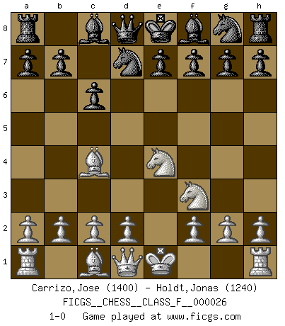 Last move : 1-0 2007 March 20 19:34:40 [Event "FICGS__CHESS__CLASS_F__000026"] [Site "FICGS"] [Date "2007.02.05"] [Round "1"] [White "Carrizo,Jose"] [Black "Holdt,Jonas"] [Result "1-0"] [WhiteElo "1400"] [BlackElo "1240"] 1.e4 c6 2.Nf3 d5 3.Nc3 dxe4 4.Nxe4 Nd7 5.Bc4 1-0 This chess game has been lost on time (started : 2007.02.05 18:9:52) Caro-Kann defense Player White won this chess game. Follow this game move after move (download)Good offense and good defense both begin with good development. (Bruce A. Moon) Das ganze Leben mit einer Ehefrau ist wie ein Endspiel mit ungleichfarbigen Läufern. (Viktor Kortschnoi) El Ajedrez por encima de todo... ¡es una pelea!. (Emanuel Lasker) On est toujours la mazette de quelqu'un d'autre. (Anonyme) Even the best needles are not sharp at both ends. (Chinese proverb)