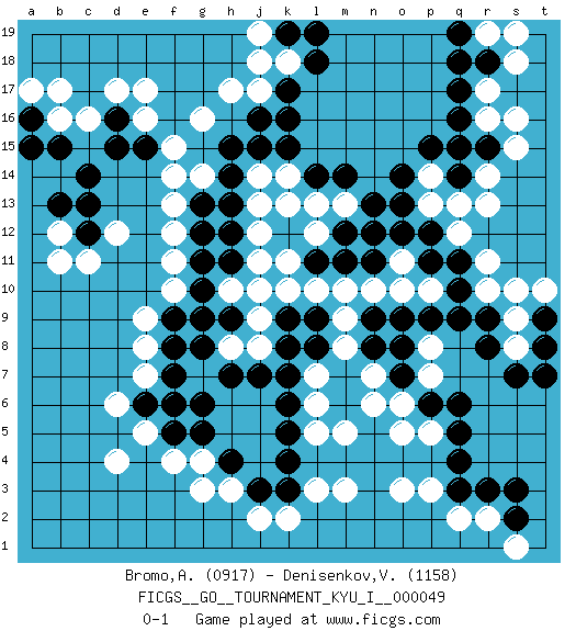 Last move : 0-1 2013 September 6 8:56:44 [Event "FICGS__GO__TOURNAMENT_KYU_I__000049"] [Site "FICGS"] [Date "2013.08.17"] [Round "1"] [Black "Bromo,Alexis"] [White "Denisenkov,Valentin"] [Result "0-1"] [Rating 1 "0917"] [Rating 2 "1158"] 1.q16 d4 2.q4 d17 3.k16 o3 4.k4 o5 5.p6 q2 6.r3 m3 7.m6 r14 8.q10 r11 9.p12 p14 10.o14 p13 11.o13 r17 12.p15 r16 13.q17 c11 14.q14 q13 15.q15 r13 16.r15 s15 17.r18 s16 18.q11 r10 19.r9 l5 20.k5 l6 21.k6 l7 22.m7 g4 23.g6 o6 24.o7 p5 25.q5 p7 26.q6 n7 27.o8 m8 28.n8 n6 29.k7 p8 30.l8 m9 31.n9 n10 32.o9 p10 33.p9 o10 34.q9 l10 35.l9 m5 36.m11 m10 37.l11 k10 38.k9 j9 39.k8 n12 40.n11 k11 41.m12 o11 42.o12 m13 43.n13 l12 44.n12 k13 45.m14 l13 46.l14 g16 47.h14 f14 48.g13 f13 49.g12 f12 50.g11 f11 51.g10 e9 52.f9 e8 53.f8 d6 54.e6 e5 55.f5 f4 56.g5 h10 57.h9 h8 58.g9 j8 59.h7 j17 60.j16 h17 61.k17 k2 62.j3 h3 63.h4 j2 64.k3 l3 65.j7 r2 66.q3 p3 67.s2 s18 68.q18 e7 69.f6 k14 70.k15 j14 71.j15 j12 72.h11 j10 73.g8 j11 74.h15 s9 75.r8 s8 76.s7 q12 77.p11 k18 78.l18 j18 79.k19 j19 80.l19 s1 81.s3 r19 82.q19 s19 83.t8 s10 84.t9 t10 85.t7 g14 86.h13 j13 87.h12 g3 88.f7 f10 89.c14 c16 90.b15 b16 91.b13 b12 92.c12 d12 93.c13 b11 94.d15 e16 95.d16 e17 96.a16 a17 97.a15 b17 98.e15 f15 0-1 Here are the names of the openings (joseki) played in the four corners : Corner q4 : q4 o3 Hoshi (Hwajeom, Seongjeom, Xingwei`) 4-4 Point. The star or hoshi (4-4) point, emphasizing influence at the potential expense of territory. Ikken Kakari (Hankan Keolch'im, Yi Gua`jiao~, 1-Space Low Approach). White 2 is the standard approach move to the 4-4. Corner q16 : q16 r14 Hoshi (Hwajeom, Seongjeom, Xingwei`) 4-4 Point. The star or hoshi (4-4) point, emphasizing influence at the potential expense of territory. Ikken Kakari (Hankan Keolch'im, Yi Gua`jiao~, 1-Space Low Approach). White 2 is the standard approach move to the 4-4. Player White won this Go (weiqi, baduk) game. Follow this game move after move (download)Big groups never die. (Anonymous) Methinks King Thibault should dub Marius Zubac a knight of the square board... I mean table, henceforth addressing him as Sir Marius, and bestow on him a suitable land from the kingdom of FICGS & marry him off to a worthy, fair maiden, lest he slice our heads with his mighty sword in his wrath. (Dinesh De Silva)