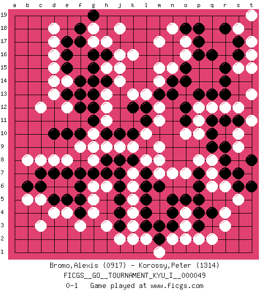 Last move : 0-1 2013 November 9 10:57:23 [Event "FICGS__GO__TOURNAMENT_KYU_I__000049"] [Site "FICGS"] [Date "2013.08.17"] [Round "1"] [Black "Bromo,Alexis"] [White "Korossy,Peter"] [Result "0-1"] [Rating 1 "0917"] [Rating 2 "1314"] 1.q16 d4 2.q4 d16 3.k10 o17 4.p17 o16 5.p16 k16 6.d10 k4 7.q10 o3 8.p4 q2 9.n5 o10 10.o12 o7 11.o5 m8 12.l7 m11 13.l12 l8 14.k8 m7 15.m6 k7 16.l6 k9 17.j8 j9 18.h8 m12 19.m13 l13 20.k12 k13 21.n13 h9 22.g9 g10 23.f10 g8 24.j7 k6 25.j6 k5 26.j5 q6 27.r8 q7 28.r7 r6 29.s6 s5 30.s7 r3 31.p3 p2 32.n3 n2 33.m3 k3 34.l4 l2 35.m2 m1 36.l5 o4 37.n4 o2 38.p5 r4 39.p7 p8 40.p6 q8 41.q9 c12 42.h10 f9 43.g11 g9 44.e10 h11 45.j10 h12 46.g12 h13 47.g13 e12 48.h14 j14 49.g7 g5 50.j4 h3 51.j3 j2 52.l3 k2 53.f7 e8 54.e7 d8 55.d7 c8 56.c7 c5 57.e5 e4 58.f5 g4 59.f4 h6 60.h7 f3 61.d5 b5 62.c6 g6 63.f6 b8 64.b6 c3 65.l9 l10 66.l11 m9 67.f14 d14 68.e15 d15 69.e16 g17 70.g16 h17 71.h16 h15 72.g14 j16 73.g15 j15 74.f17 d17 75.e17 g18 76.f18 d18 77.g19 j18 78.e13 d13 79.f12 e14 80.f13 m15 81.o14 p11 82.q11 p12 83.p13 q12 84.q13 r12 85.r11 s12 86.s11 s9 87.r13 t15 88.s16 s15 89.r15 t13 90.r14 t16 91.s17 t17 92.t18 s18 93.r18 t19 94.o18 n18 95.p18 m17 96.o15 n15 97.n14 m14 98.o11 p10 99.r9 s10 100.t8 t11 101.t6 n7 0-1 Here are the names of the openings (joseki) played in the four corners : Corner q16 : q16 o17 Hoshi (Hwajeom, Seongjeom, Xingwei`) 4-4 Point. The star or hoshi (4-4) point, emphasizing influence at the potential expense of territory. Ikken Kakari (Hankan Keolch'im, Yi Gua`jiao~, 1-Space Low Approach). White 2 is the standard approach move to the 4-4. Corner q4 : q4 o3 Hoshi (Hwajeom, Seongjeom, Xingwei`) 4-4 Point. The star or hoshi (4-4) point, emphasizing influence at the potential expense of territory. Ikken Kakari (Hankan Keolch'im, Yi Gua`jiao~, 1-Space Low Approach). White 2 is the standard approach move to the 4-4. Corner d4 : d4 j8 Hoshi (Hwajeom, Seongjeom, Xingwei`) 4-4 Point. The star or hoshi (4-4) point, emphasizing influence at the potential expense of territory. Player White won this Go (weiqi, baduk) game. Follow this game move after move (download)Beware of the clumsy double contact. (Anonymous) Life is painting a picture, not doing a sum. (Oliver Wendell Holmes, Jr.)