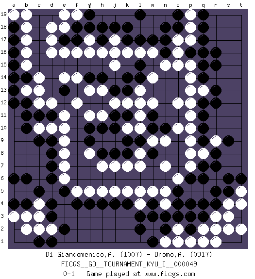 Last move : 0-1 2014 March 13 3:27:5 [Event "FICGS__GO__TOURNAMENT_KYU_I__000049"] [Site "FICGS"] [Date "2013.08.17"] [Round "1"] [Black "Di Giandomenico,Alfonso"] [White "Bromo,Alexis"] [Result "0-1"] [Rating 1 "1007"] [Rating 2 "0917"] 1.d4 q16 2.r5 d16 3.q10 k16 4.k4 d10 5.o5 k10 6.r13 o12 7.r15 p14 8.r16 q13 9.q12 p12 10.q11 p11 11.q17 p17 12.q18 p18 13.q19 p19 14.q14 p13 15.q15 p15 16.p16 o16 17.q16 p9 18.q9 n7 19.d9 e9 20.d8 e8 21.d7 e7 22.d6 e6 23.e5 f5 24.f4 g5 25.g4 h5 26.h4 j5 27.j4 k5 28.m4 m5 29.d11 c10 30.c9 e10 31.c11 d12 32.b10 c12 33.b12 e11 34.b11 b13 35.a12 c13 36.a13 l4 37.l3 l5 38.n3 n5 39.o4 n4 40.m3 o6 41.p6 p7 42.q7 q8 43.r8 p8 44.q6 c3 45.d3 c4 46.c5 d2 47.e2 b5 48.b6 a5 49.a6 b2 50.b4 b3 51.a4 a3 52.d1 r3 53.q3 q2 54.p2 p3 55.q4 o2 56.o3 p1 57.p4 r2 58.p2 o1 59.p3 s4 60.s5 t5 61.t6 t4 62.s6 r1 63.n2 n1 64.m1 q1 65.l2 s2 66.t3 t2 67.r4 s3 68.e17 f16 69.f17 g17 70.g18 d17 71.h17 g16 72.j18 j17 73.k18 e18 74.f18 d18 75.l17 l16 76.k17 j16 77.m17 m16 78.n17 o17 79.l19 f19 80.g19 e19 81.h18 h16 82.n16 n15 83.n18 a14 84.b14 b15 85.a15 c14 86.a14 b16 87.a16 b17 88.a17 b18 89.a18 b19 90.k11 k12 91.k13 l12 92.j13 h13 93.h14 j12 94.h12 g13 95.g12 f12 96.j11 g11 97.j10 l11 98.k9 l10 99.j8 j7 100.h8 h7 101.k8 k7 102.g10 h11 103.h10 g8 104.g9 l8 105.l9 m9 106.m8 l7 107.m10 n9 108.m11 m12 109.n10 o10 110.o19 o15 111.o18 c2 112.c1 r9 113.r7 p10 114.r12 e16 115.s9 a19 116.l15 l13 117.l14 m14 118.k14 j15 119.g14 f14 120.e13 e14 0-1 This go game has been lost on time (started : 2013.08.17 18:3:34) Here are the names of the openings (joseki) played in the four corners : Corner q16 : q16 r13 Hoshi (Hwajeom, Seongjeom, Xingwei`) 4-4 Point. The star or hoshi (4-4) point, emphasizing influence at the potential expense of territory. Niken Kakari (Dukan Keolch'im, E`r Gua`jiao~, 2-Space Low Approach). White typically answers by 7-3 or 3-5 (which is not joseki). Corner d16 : d16 d11 Hoshi (Hwajeom, Seongjeom, Xingwei`) 4-4 Point. The star or hoshi (4-4) point, emphasizing influence at the potential expense of territory. Player White won this Go (weiqi, baduk) game. Follow this game move after move (download)Five liberties for tactical stability. (Anonymous) A woman without a man is like a fish without a bicycle. (Gloria Steinem)