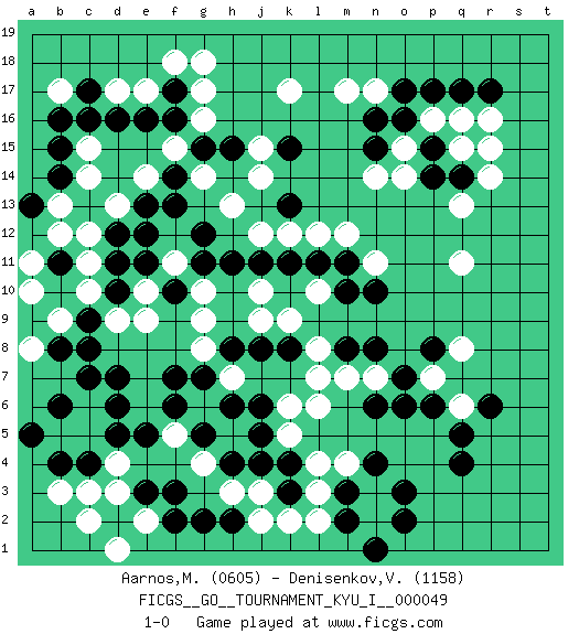 Last move : 1-0 2013 September 15 18:55:0 [Event "FICGS__GO__TOURNAMENT_KYU_I__000049"] [Site "FICGS"] [Date "2013.08.17"] [Round "1"] [Black "Aarnos,Mikko"] [White "Denisenkov,Valentin"] [Result "1-0"] [Rating 1 "0605"] [Rating 2 "1158"] 1.q17 d4 2.c16 q15 3.o16 q11 4.q4 q6 5.p6 p7 6.o6 q8 7.e16 k17 8.d7 c11 9.e5 c6 10.d5 c5 11.c7 c3 12.d10 c14 13.d11 c10 14.d12 c12 15.k15 g17 16.g15 n17 17.n16 m17 18.q14 r14 19.p14 q13 20.b15 c15 21.b14 b13 22.f3 l3 23.o3 h3 24.j4 j3 25.g5 d17 26.d16 e17 27.c9 b9 28.b8 a10 29.b11 a11 30.b6 b12 31.a13 e14 32.f13 d13 33.e13 b17 34.b16 f15 35.f16 g16 36.f14 r16 37.r17 p16 38.p15 r15 39.p17 n14 40.d2 c2 41.b4 b5 42.a5 b3 43.k4 e2 44.e3 d3 45.f2 d1 46.k13 q16 47.o17 o15 48.n15 o14 49.k8 l10 50.m8 j10 51.n10 n11 52.m10 l12 53.m11 m12 54.f17 f18 55.c17 g18 56.l11 k12 57.k11 j12 58.j11 g14 59.h15 h13 60.h11 j14 61.h2 n2 62.o2 j2 63.k3 k2 64.g2 j15 65.m3 n3 66.n4 m4 67.m2 l2 68.n1 l4 69.q5 l6 70.j6 l7 71.r6 l8 72.o7 k9 73.j8 h5 74.h4 k5 75.j5 n7 76.n8 m7 77.n6 j9 78.g12 g9 79.h8 g8 80.d6 d9 81.c8 e9 82.f10 f11 83.e11 e10 84.e12 g10 85.g11 h7 86.g7 g6 87.f7 g4 88.h6 f5 89.f6 k6 90.p8 a8 91.c4 1-0 Here are the names of the openings (joseki) played in the four corners : Corner q16 : q17 q15 Komoku (Somok, Xiao~mu`) 3-4 Point. The komoku (3-4) point is the traditional corner enclosure move.. Ikken Takagakari (Hankan Nop'dakeolch'im, Yi Gaogua`jiao~, 1-Space High Approach). The 5-4 approach move has become more popular in modern times, as modern Go emphasizes speed and influence. Corner q4 : q4 q6 Hoshi (Hwajeom, Seongjeom, Xingwei`) 4-4 Point. The star or hoshi (4-4) point, emphasizing influence at the potential expense of territory. Ikken Takagakari (Hankan Nop'dakeolch'im, Yi Gaojia, 1-Space High Approach). Black typically responds at 6-4 or 3-10. Black 4-10 is played when Black finds play on the right side advantageous. Black 4-8 or 3-8 may be played when Black has support at top. Corner d4 : d4 d7 Hoshi (Hwajeom, Seongjeom, Xingwei`) 4-4 Point. The star or hoshi (4-4) point, emphasizing influence at the potential expense of territory. Niken Takagakari (Dukan Nop'dakeolch'im, E`r Gaojia, 2-Space High Approach). Black 2 is a light approach move. Rarely played in even games, Black 2 is typically employed in handicap games. White continues with 6-4 or 3-10. In Korean Sunjang Baduk White has a stone on 8-4. Player Black won this Go (weiqi, baduk) game. Follow this game move after move (download)Attach to the strongest stone in a pincer. (Anonymous) I can't decide which is riskier; taking crazy risks, or taking advice on crazy risks from a crazy risk taker. (Gregory House in House M.D.)