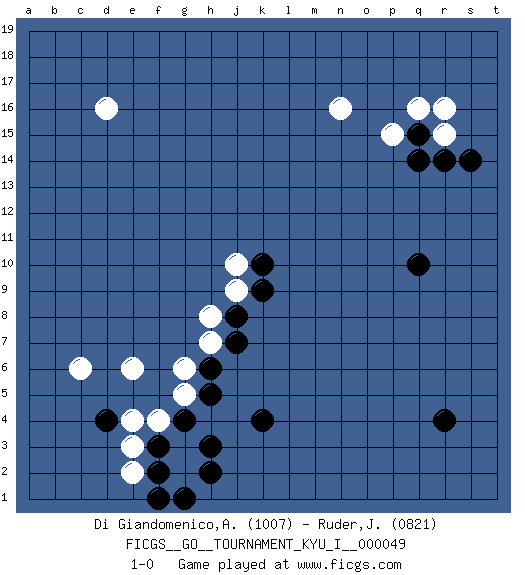 Last move : 1-0 2013 November 1 5:27:39 [Event "FICGS__GO__TOURNAMENT_KYU_I__000049"] [Site "FICGS"] [Date "2013.08.17"] [Round "1"] [Black "Di Giandomenico,Alfonso"] [White "Ruder,John"] [Result "1-0"] [Rating 1 "1007"] [Rating 2 "0821"] 1.d4 q16 2.r4 d16 3.k4 c6 4.q10 f4 5.q15 r15 6.r14 p15 7.q14 r16 8.s14 n16 9.g4 e6 10.f3 g3 11.h3 g2 12.h2 e3 13.f2 e2 14.f1 g5 15.g1 e4 16.h5 g6 17.h6 h7 18.j7 h8 19.j8 j9 20.k9 j10 21.k10 1-0 This go game has been lost on time (started : 2013.08.17 18:3:34) Here are the names of the openings (joseki) played in the four corners : Corner d4 : d4 c6 Hoshi (Hwajeom, Seongjeom, Xingwei`) 4-4 Point. The star or hoshi (4-4) point, emphasizing influence at the potential expense of territory. Ikken Kakari (Hankan Keolch'im, Yi Gua`jiao~, 1-Space Low Approach). White 2 is the standard approach move to the 4-4. Corner q16 : q16 q15 Hoshi (Hwajeom, Seongjeom, Xingwei`) 4-4 Point. The star or hoshi (4-4) point, emphasizing influence at the potential expense of territory. Player Black won this Go (weiqi, baduk) game. Follow this game move after move (download)Conservative and slow will win. Believe it ! (Anonymous) Watch your thoughts; they become words. Watch your words; they become actions. Watch your actions; they become habits. Watch your habits; they become character. Watch your character; it becomes your destiny. (Frank Outlaw)