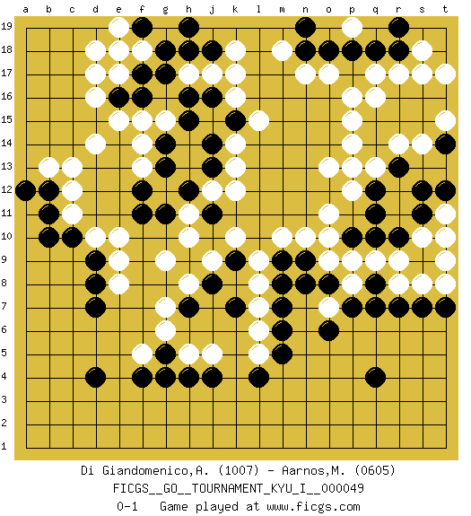 Last move : 0-1 2014 March 27 22:36:21 [Event "FICGS__GO__TOURNAMENT_KYU_I__000049"] [Site "FICGS"] [Date "2013.08.17"] [Round "1"] [Black "Di Giandomenico,Alfonso"] [White "Aarnos,Mikko"] [Result "0-1"] [Rating 1 "1007"] [Rating 2 "0605"] 1.d4 q16 2.q4 d16 3.q10 d10 4.l4 k16 5.h4 k10 6.q15 p15 7.q14 p16 8.r16 r17 9.s16 o13 10.p13 o11 11.q11 o9 12.d9 e9 13.d8 e10 14.c10 c11 15.b10 e8 16.d7 c13 17.q7 e17 18.f17 h17 19.e18 d18 20.e16 d17 21.f16 f13 22.h18 j17 23.j18 k18 24.g17 f18 25.g18 e19 26.f19 g19 27.h19 o7 28.h16 g15 29.h15 k14 30.g14 f14 31.g13 f15 32.j14 k13 33.j13 j12 34.h12 h11 35.j11 k12 36.g11 h10 37.f12 d14 38.f11 g9 39.h9 h8 40.f19 e18 41.j16 k17 42.h7 g7 43.j8 j9 44.k7 p12 45.q12 p14 46.k9 s17 47.t16 g6 48.g5 f5 49.f4 h5 50.g4 j5 51.j4 l5 52.m5 l6 53.m6 l7 54.m7 l8 55.m8 l9 56.m9 m10 57.n9 n10 58.o8 p8 59.n8 p9 60.p7 r9 61.s9 r8 62.r7 s8 63.s7 s10 64.s11 t11 65.t12 t10 66.r10 t9 67.s12 e15 68.b11 c12 69.b12 b13 70.a12 q13 71.r13 p13 72.t7 t8 73.q8 q9 74.q18 q17 75.p18 o17 76.o18 n17 77.n18 m18 78.k15 l15 79.r18 s18 80.r19 t17 81.n19 r14 82.r15 s14 83.t14 t15 84.s15 t15 85.p10 o10 86.o6 p19 0-1 Here are the names of the openings (joseki) played in the four corners : Corner q16 : q16 q15 Hoshi (Hwajeom, Seongjeom, Xingwei`) 4-4 Point. The star or hoshi (4-4) point, emphasizing influence at the potential expense of territory. Player White won this Go (weiqi, baduk) game. Follow this game move after move (download)Don't overlook the edge of the board. (Anonymous) Art disturbs, science reassures. (Georges Braque, Le Jour et la Nuit)