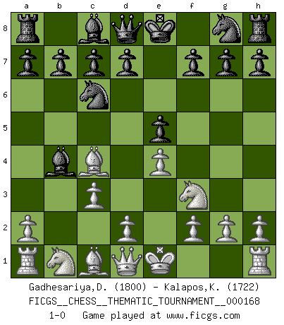 Last move : 1-0 2013 October 11 15:54:36 [Event "FICGS__CHESS__THEMATIC_TOURNAMENT__000168"] [Site "FICGS"] [Date "2013.08.18"] [Round "1"] [White "Gadhesariya,Divyesh"] [Black "Kalapos,Karol"] [Result "1-0"] [WhiteElo "1800"] [BlackElo "1722"] 1.e4 e5 2.Nf3 Nc6 3.Bc4 Bc5 4.b4 Bxb4 5.c3 1-0 This chess game has been lost on time (started : 2013.08.18 12:13:35) Evans gambit Player White won this chess game. Follow this game move after move (download)I still hope to kill Fischer. (Boris Spassky) Irgendwie scheint mir sonntags früh um 9 Uhr der Killerinstinkt verloren gegangen zu sein. (Alexej Shirov) El Ajedrez es en su esencia, un juego. En su forma, un arte. Y en su ejecución, una ciencia. (Baron Tassilo) Même si l'adversaire joue le coup analysé précédemment, recommencez l'analyse en voyant la nouvelle position. Première règle de Blumenfeld Whenever people agree with me, I always feel I must be wrong. (Oscar Wilde)