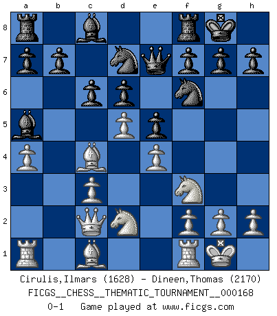 Last move : 0-1 2013 December 10 21:15:30 [Event "FICGS__CHESS__THEMATIC_TOURNAMENT__000168"] [Site "FICGS"] [Date "2013.08.18"] [Round "1"] [White "Cirulis,Ilmars"] [Black "Dineen,Thomas"] [Result "0-1"] [WhiteElo "1628"] [BlackElo "2170"] 1.e4 e5 2.Nf3 Nc6 3.Bc4 Bc5 4.b4 Bxb4 5.c3 Ba5 6.Qb3 Qe7 7.O-O Nf6 8.d4 O-O 9.d5 Nb8 10.Nbd2 d6 11.Qc2 Nbd7 12.a4 c6 0-1 Evans gambit Kingside Castling by player White (move 7) Kingside Castling by player Black (move 8) Player Black won this chess game. Follow this game move after move (download)Bobby just drops the pieces and they fall on the right squares. (Miguel Najdorf) Frage: Gibt es etwas was Sie mehr lieben als Autobahnen ohne Tempobegrenzungen? - Antwort: Deutsche Frauen ohne Tempobegrenzungen. (Loek van Wely) Los problemas de Ajedrez exigen del compositor las mismas virtudes que caracterizan todo el arte de valor: originalidad, invención, concisión, armonía, complejidad e insinceridad explendida. (Vladimir Nabokov) Je ne suis pas le dernier à jouer lâchement des coups douteux pendant le zeïtnot de l'adversaire pour l'achever: en effet les coups qui font le plus peur sont ceux que l'on ne comprend pas. Je me fais souvent peur quand je joue. (Un professeur anonyme) Every man's memory is his private literature. (Aldous Huxley)