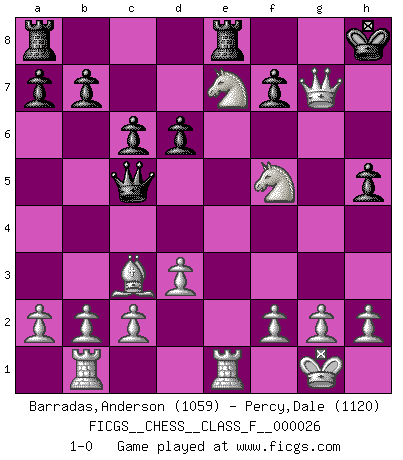 Last move : 1-0 2007 February 28 19:49:4 [Event "FICGS__CHESS__CLASS_F__000026"] [Site "FICGS"] [Date "2007.02.05"] [Round "1"] [White "Barradas,Anderson"] [Black "Percy,Dale"] [Result "1-0"] [WhiteElo "1059"] [BlackElo "1120"] 1.e4 e5 2.Nf3 Nf6 3.Nxe5 d6 4.Nf3 Nxe4 5.Bd3 Nc5 6.O-O Nc6 7.Bb5 Bd7 8.Re1+ Be7 9.Bxc6 Bxc6 10.d3 O-O 11.Be3 Ne6 12.Nc3 Bf6 13.Rb1 Nd4 14.Bxd4 Bd5 15.Nxd5 c6 16.Bxf6 Qa5 17.Ne7+ Kh8 18.Bc3 Qb5 19.Nd4 Qc5 20.Qg4 h5 21.Ndf5 Rfe8 22.Qxg7+ 1-0 Petrov's defense Kingside Castling by player White (move 6) Kingside Castling by player Black (move 10) Player White won this chess game. Follow this game move after move (download)You know, comrade Pachman, I don't enjoy being a Minister, I would rather play Chess like you. (Che Guevara) Nach Morphy wurde nichts neues mehr in der Behandlung offener Positionen gefunden. (Mikhail Moiseyevich Botvinik) Debes de llevar a tu oponente hacia un profundo y obscuro bosque donde 2+2=5, y el camino que conduce a la salida es suficientemente ancho para solamente uno. (Mikhail Tal) Il s'avisa de me proposer d'apprendre les échecs qu'il jouait un peu... me voilà forcené des échecs. J'achète un échiquier, je m'enferme dans ma chambre, j'y passe des jours et des nuits à vouloir apprendre par cur toutes les parties. (Jean-Jacques Rousseau, Confessions) Just because you do not take an interest in politics doesn't mean politics won't take an interest in you. (Pericles 430 B.C.)