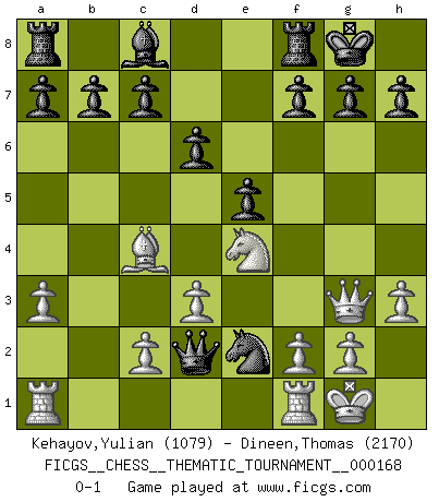 Last move : 0-1 2013 August 22 8:32:49 [Event "FICGS__CHESS__THEMATIC_TOURNAMENT__000168"] [Site "FICGS"] [Date "2013.08.18"] [Round "1"] [White "Kehayov,Yulian"] [Black "Dineen,Thomas"] [Result "0-1"] [WhiteElo "1079"] [BlackElo "2170"] 1.e4 e5 2.Nf3 Nc6 3.Bc4 Bc5 4.b4 Bxb4 5.Bb2 d6 6.h3 Nf6 7.O-O Nxe4 8.d3 Ng5 9.a3 Ba5 10.Bc3 Bxc3 11.Nxc3 O-O 12.Nxg5 Qxg5 13.Qf3 Nd4 14.Qg3 Qd2 15.Ne4 Ne2+ 0-1 Evans gambit Kingside Castling by player White (move 7) Kingside Castling by player Black (move 11) Player Black won this chess game. Follow this game move after move (download)Human affairs are like a Chess game: only those who do not take it seriously can be called good players. (Hung Tzu Ch'eng) Intelligenz läßt sich nicht am Weg, sondern nur am Ergebnis feststellen. (Garry Kasparov) La maestría del Ajedrez consiste esencialmente en analizar posiciónes de Ajedrez con precisión. (Mikhail Botvinnik) Les pièces de l'échiquier étaient impitoyables. Elles le retenaient, elles l'absorbaient. Il y avait de l'horreur en cela, mais aussi une harmonie unique. Car, qu'y a-t-il dans le monde, à part les échecs ? (V. Nabokov) You have to believe in yourself. (Sun Tzu)