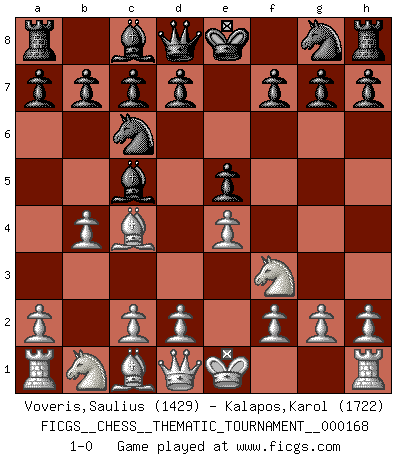 Last move : 1-0 2013 October 4 15:15:59 [Event "FICGS__CHESS__THEMATIC_TOURNAMENT__000168"] [Site "FICGS"] [Date "2013.08.18"] [Round "1"] [White "Voveris,Saulius"] [Black "Kalapos,Karol"] [Result "1-0"] [WhiteElo "1429"] [BlackElo "1722"] 1.e4 e5 2.Nf3 Nc6 3.Bc4 Bc5 4.b4 1-0 This chess game has been lost on time (started : 2013.08.18 12:13:35) Evans gambit declined Player White won this chess game. Follow this game move after move (download)Some sacrifices are sound; the rest are mine. (Mikhail Tal) Was ist der Unterschied zwischen einem Strassenarbeiter und einem Schachspieler? --Der Schachspieler bewegt sich ab und zu. (Anonymous) El Jaque al descubierto es el bombardero del tablero. (Reuben Fine) Les Echecs sont et restent toujours un combat, un combat intégral comme la boxe, la lutte ou un autre sport, et où il doit y avoir un vainqueur et un vaincu. (Joseph Emil Diemer) The production of too many useful things results in too many useless people. (Karl Marx)