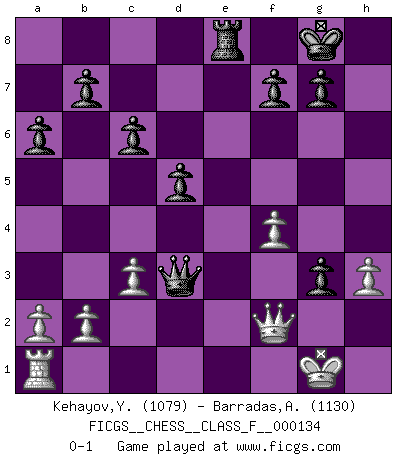 Last move : 0-1 2013 August 23 6:29:4 [Event "FICGS__CHESS__CLASS_F__000134"] [Site "FICGS"] [Date "2013.08.18"] [Round "1"] [White "Kehayov,Yulian"] [Black "Barradas,Anderson"] [Result "0-1"] [WhiteElo "1079"] [BlackElo "1130"] 1.d4 d5 2.e3 a6 3.Be2 Nf6 4.Nf3 Nc6 5.O-O Bg4 6.h3 Bxf3 7.Bxf3 e5 8.dxe5 Nxe5 9.Nc3 Nxf3+ 10.Qxf3 c6 11.Ne2 Bd6 12.Nd4 O-O 13.Re1 Re8 14.c3 Ne4 15.Qe2 Qf6 16.Nf3 Ng5 17.Nxg5 Qxg5 18.Qf3 Re4 19.Qe2 Qe5 20.g3 Re8 21.Bd2 h5 22.f4 Qe6 23.Qg2 Bc5 24.Kf2 Bxe3+ 25.Rxe3 Rxe3 26.Bxe3 Qxe3+ 27.Kf1 h4 28.Qf2 Qd3+ 29.Kg1 hxg3 0-1 Queen's pawn game Kingside Castling by player White (move 5) Kingside Castling by player Black (move 12) Player Black won this chess game. Follow this game move after move (download)The battle for the ultimate truth will never be won. And that's why Chess is so fascinating. (Hans Kmoch) Rauchen ist dem Schachspieler bei seiner Arbeit, also im Wettkampf, untersagt. (Viktor Kortschnoi) El Ajedrez lo es todo: arte, ciencia y deporte. (Anatoly Karpov) Même si l'adversaire joue le coup analysé précédemment, recommencez l'analyse en voyant la nouvelle position. Première règle de Blumenfeld Beta. Software undergoes beta testing shortly before it's released. Beta is latin for still doesn't work. (Anonymous)
