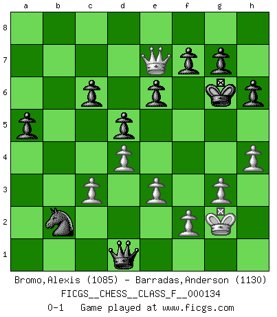 Last move : 0-1 2013 August 27 20:13:48 [Event "FICGS__CHESS__CLASS_F__000134"] [Site "FICGS"] [Date "2013.08.18"] [Round "1"] [White "Bromo,Alexis"] [Black "Barradas,Anderson"] [Result "0-1"] [WhiteElo "1085"] [BlackElo "1130"] 1.d4 Nf6 2.c4 e6 3.Nc3 Bb4 4.Bd2 O-O 5.a3 Bxc3 6.Bxc3 d5 7.e3 c6 8.Nf3 Ne4 9.h3 Nxc3 10.bxc3 Nd7 11.c5 b6 12.a4 a5 13.Bd3 Ba6 14.Bxa6 Rxa6 15.cxb6 Nxb6 16.Qc2 Nc4 17.h4 h6 18.g3 Rb6 19.O-O Qf6 20.Rfb1 Rxb1+ 21.Qxb1 Qxf3 22.Qd3 Rb8 23.Rb1 Rb2 24.Rxb2 Nxb2 25.Qa6 Qd1+ 26.Kg2 Qxa4 27.Qc8+ Kh7 28.Qf8 Kg6 29.Qe7 Qd1 0-1 Nimzo-Indian defense Kingside Castling by player Black (move 4) Kingside Castling by player White (move 19) Player Black won this chess game. Follow this game move after move (download)After black's reply to 1.e4 with 1..e5, leaves him always trying to get into the game. (Howard Staunton) Vom Schach wurde gesagt das Leben sei dafür nicht lange genug. Aber das ist der Fehler des Lebens, nicht des Schach'. (Irving Chernev) Durante una competencia de Ajedrez, un Maestro de Ajedrez deberá ser una combinación de presa de caza y un Monge. (Alexander Alekhine) J'ai vu le vaincu d'Echecs jouer des années durant dans l'espoir de la fête de la victoire. Car tu es plus riche de ce qu'elle existe si même elle n'est point pour toi. Ainsi de la perle du fond des mers. (Antoine de Saint-Exupéry) In God we trust, all others we virus scan. (Anonymous)